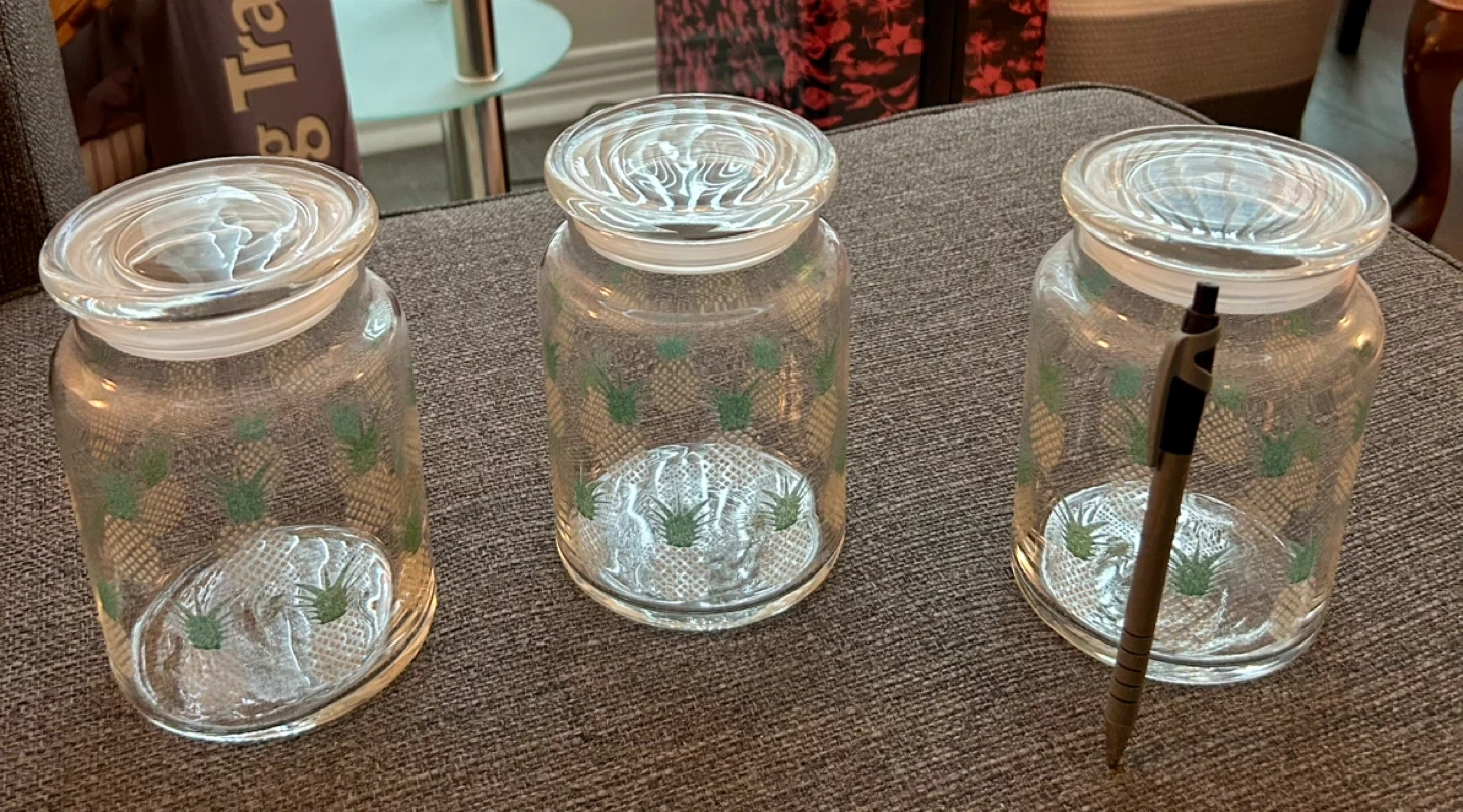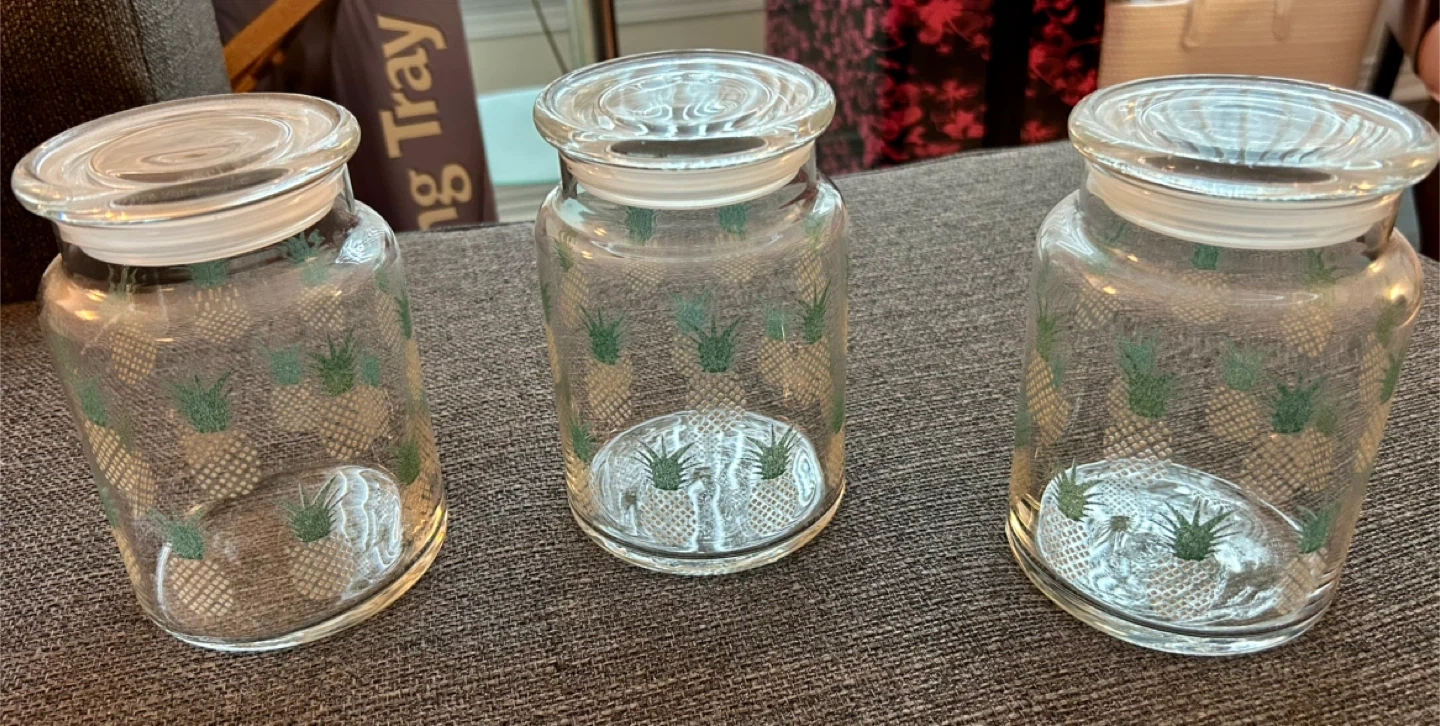 Set of three clear glass storage jars featuring a green pineapple design. These jars come with clear glass lids, perfect for kitchen counter or pantry/bathroom organization.