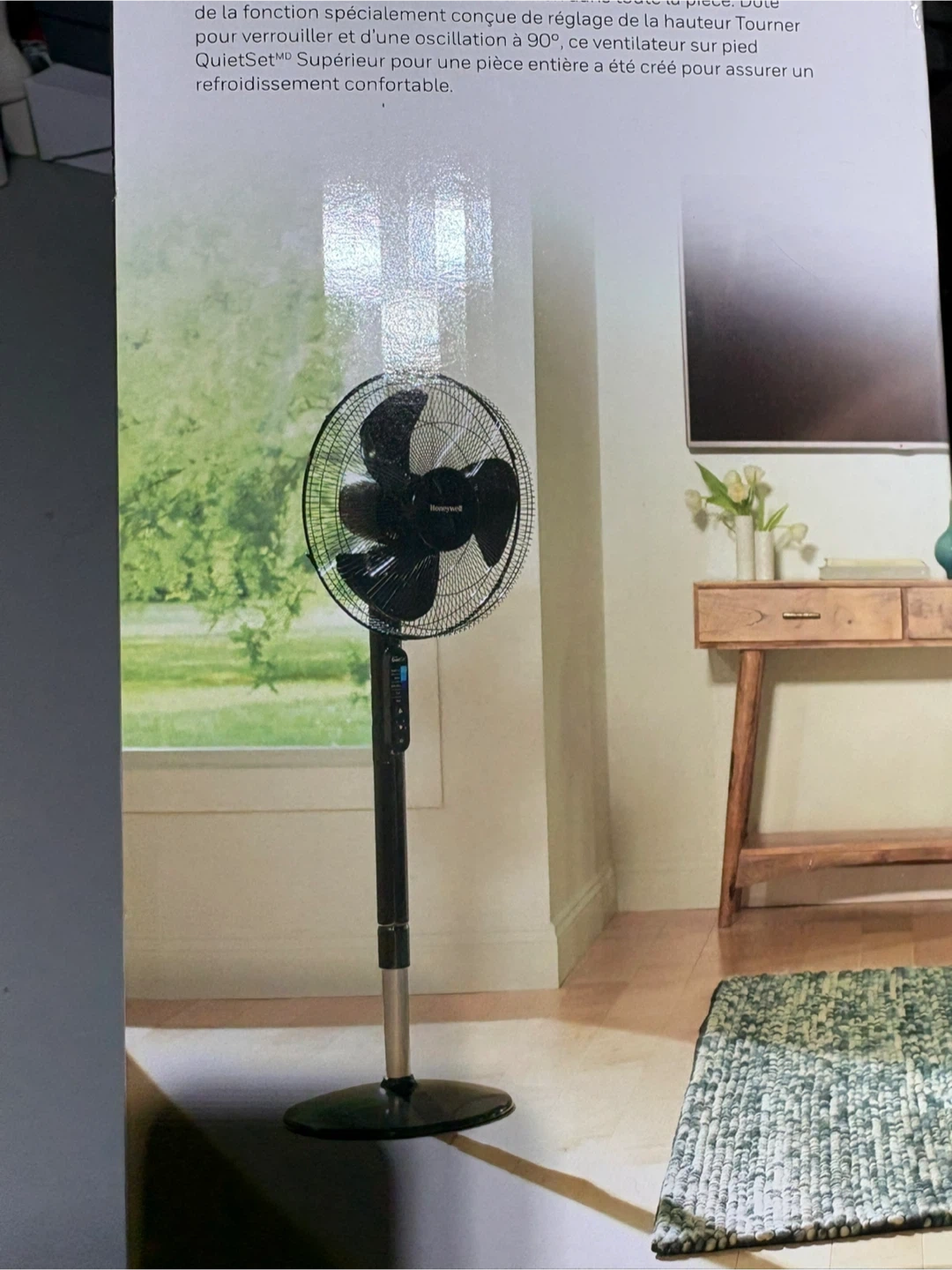 This is the Honeywell QuietSet 5 whole room 16-inch stand fan. It has 5 cooling levels including Power Cool, Breeze, White Noise, Calm, and Sleep. The fan features an auto-off timer, oscillation, twist & lock height adjustment, and adjustable fan head. A remote control is also included.