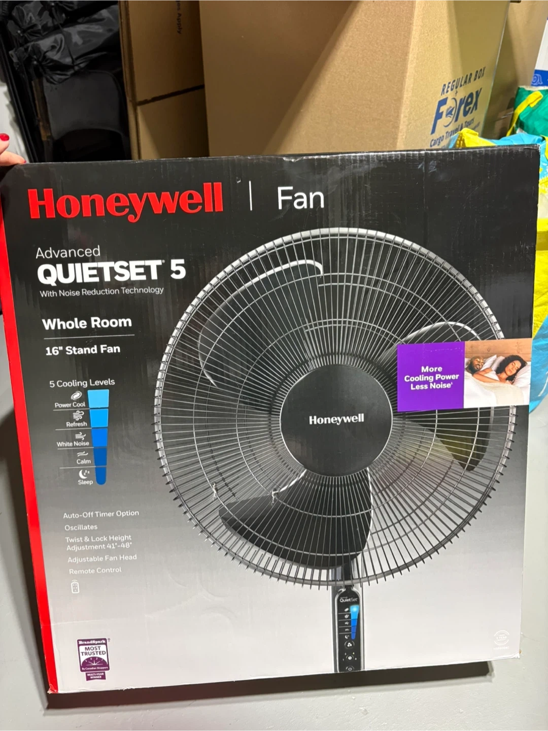This is the Honeywell QuietSet 5 whole room 16-inch stand fan. It has 5 cooling levels including Power Cool, Breeze, White Noise, Calm, and Sleep. The fan features an auto-off timer, oscillation, twist & lock height adjustment, and adjustable fan head. A remote control is also included.