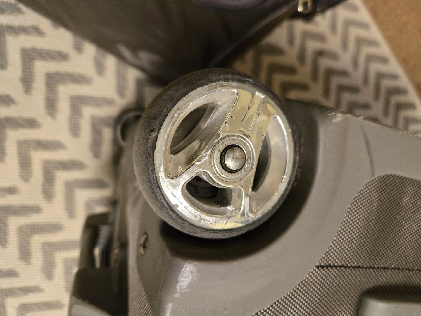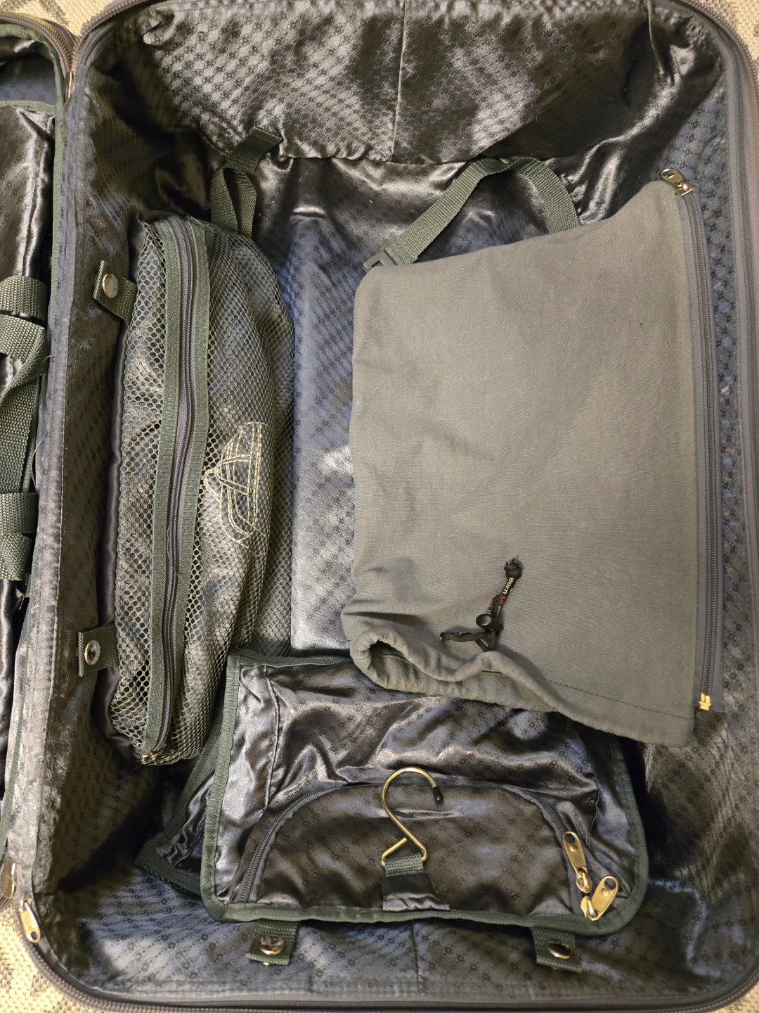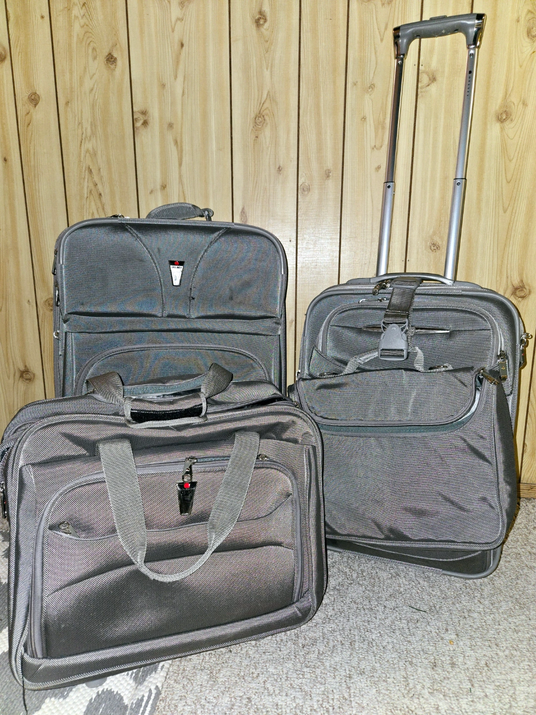 Three-piece luggage set. Silver/grey soft-sided fabric exterior, quiet rubber wheels. Large suitcase, carry-on suitcase and a smaller overnighter tote bag. Includes interior packing organizers.