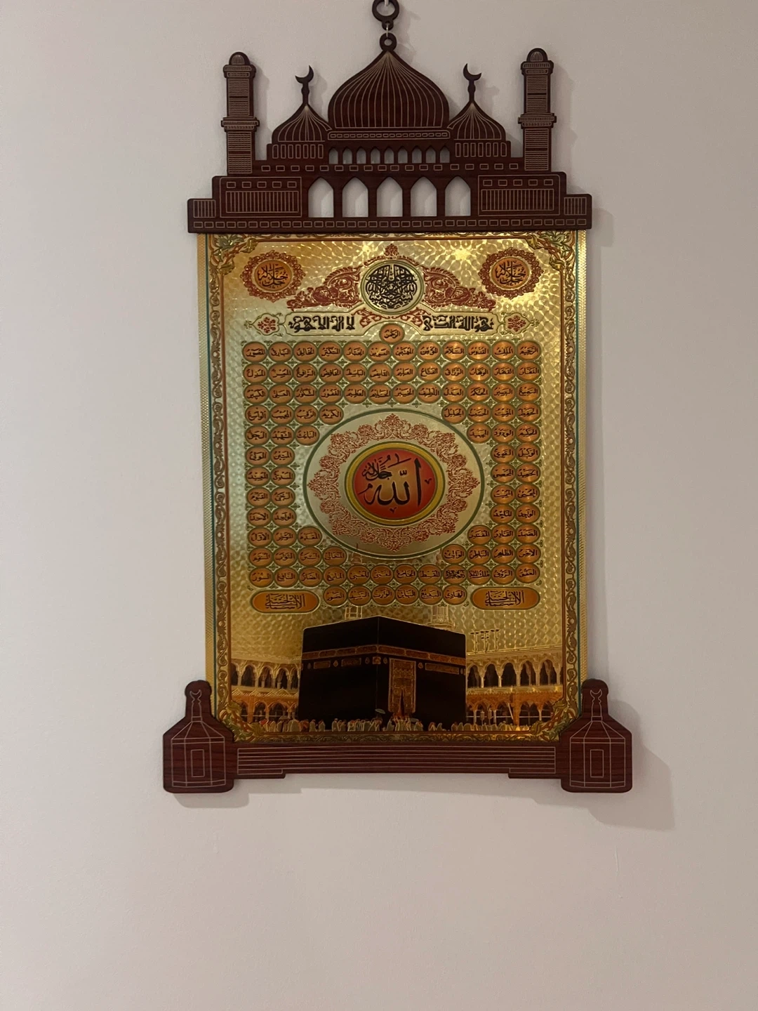 This decorative Islamic wall art features a depiction of the Kaaba and the 99 names of Allah. It's made from wood and has a gold-toned background. This piece is great for adding an Islamic touch to your home decor.