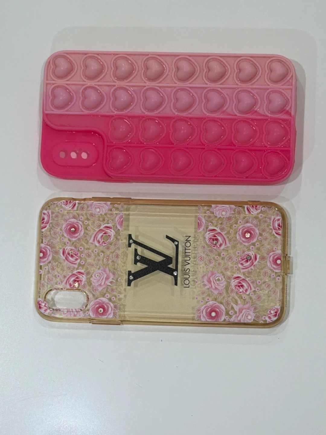 71Selling two phone cases! One is a pink ombre heart pop-it case, and the other is a floral case with a Louis Vuitton-inspired design Both for iphone x / xs