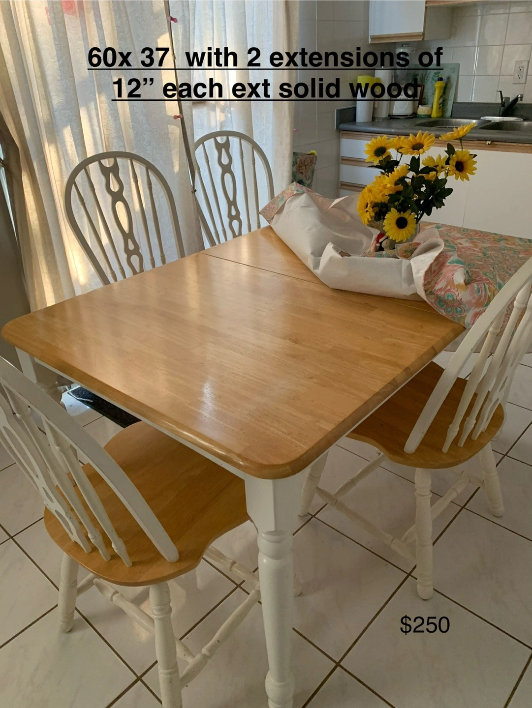 Solid wood kitchen table with two extensions. White legs and a natural wood top. Includes four chairs. $250