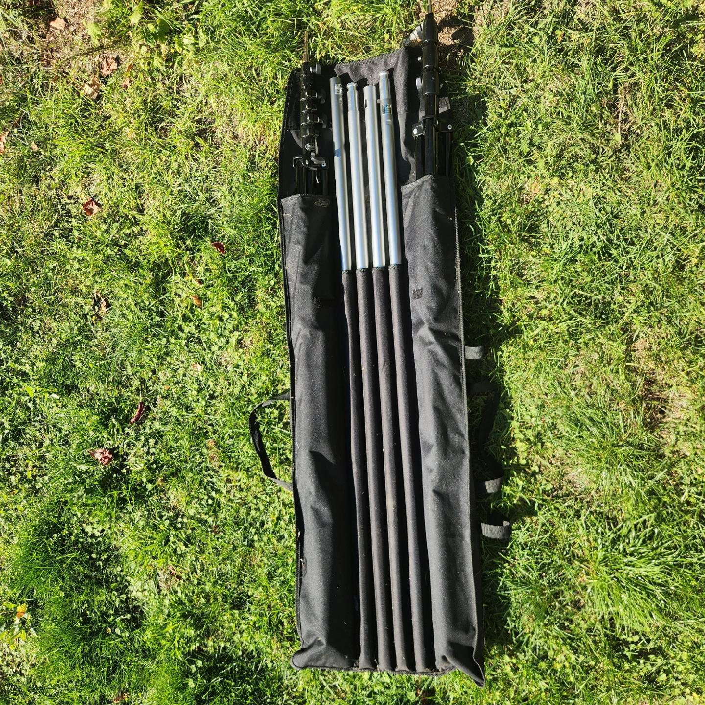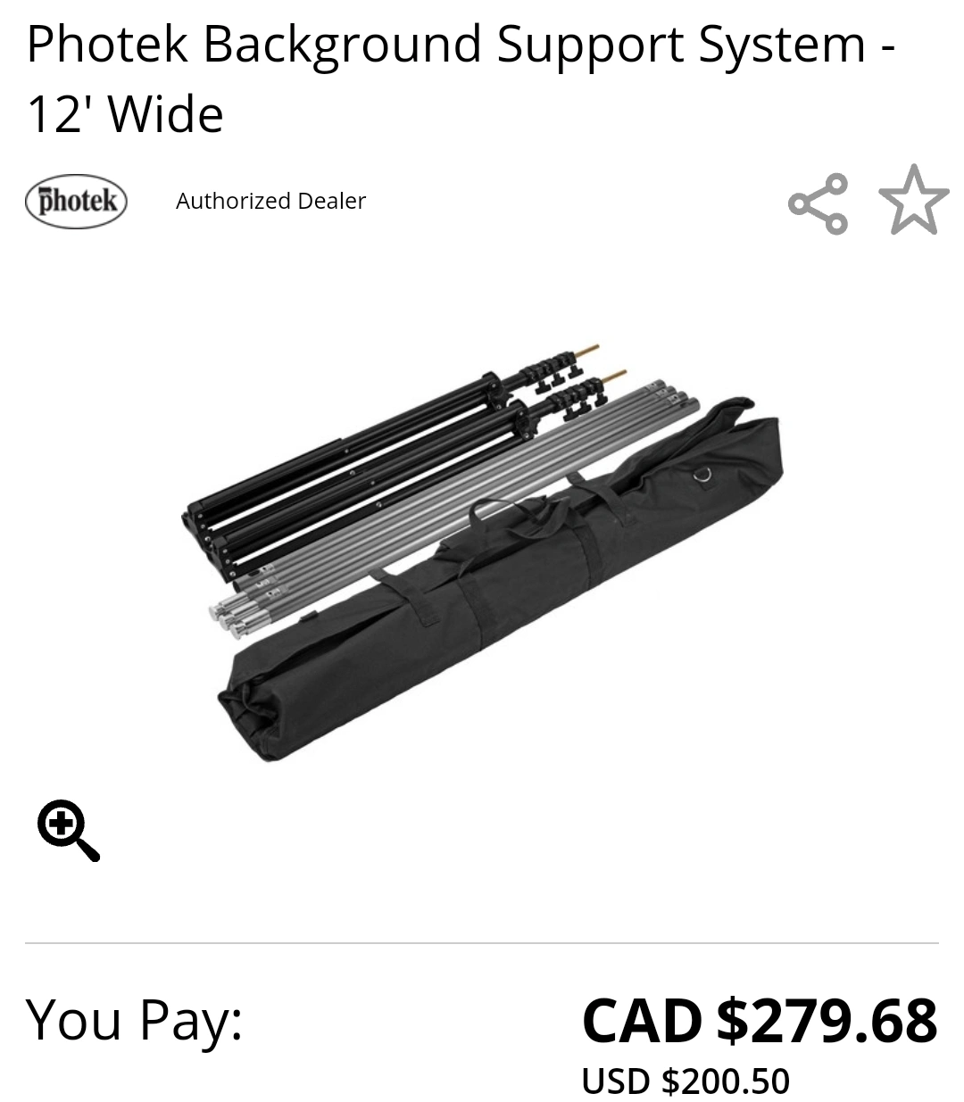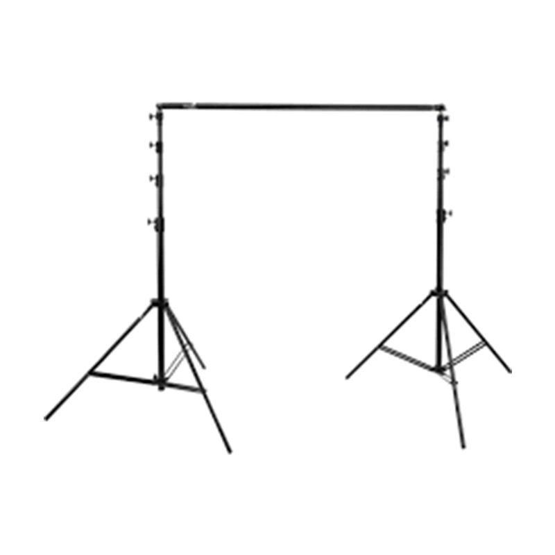 Photek Background Support System Strong support for paper, or cloth backgrounds. Crossbar may be used in 2 or 3 sections, Extend 6 to 12′ Wide. Supports Backdrops up to 20 lb Support Stands Convert into Light stands The system consists of 2 heavy-duty professional support stands with 3 positive locking levers and tubular legs, a sturdy 4 piece crossbar that snaps together with positive button locking devices, and a heavy-duty canvas carry bag.The carry bag has pockets for the stands and the poles, keeping everything in place when traveling. The carry bag also has two handles and one shoulder strap.