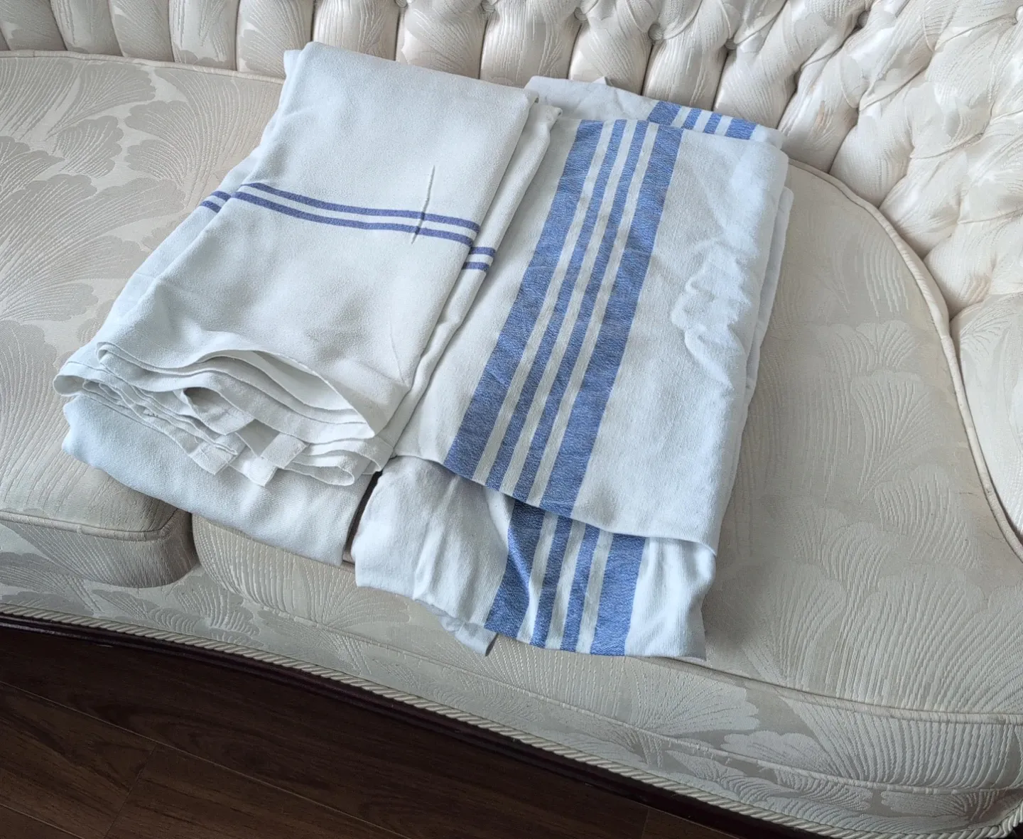 Two bed sheet with classic blue stripes. They're made of a durable cotton blend. Perfect for bedroom