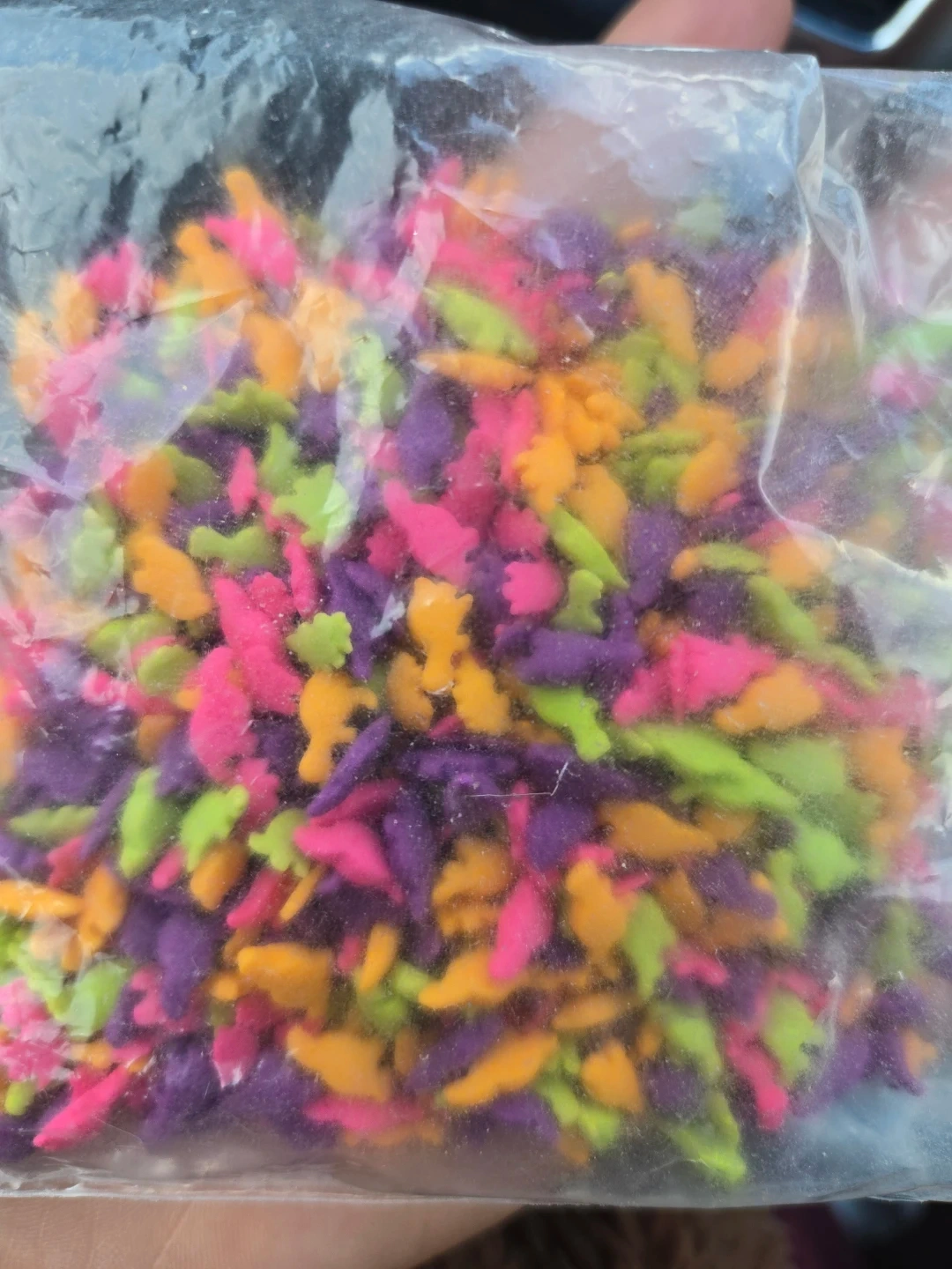 These are fun dinosaur-shaped sprinkles in bright pink, purple, green, and orange. Perfect for decorating cupcakes or cookies for a party!