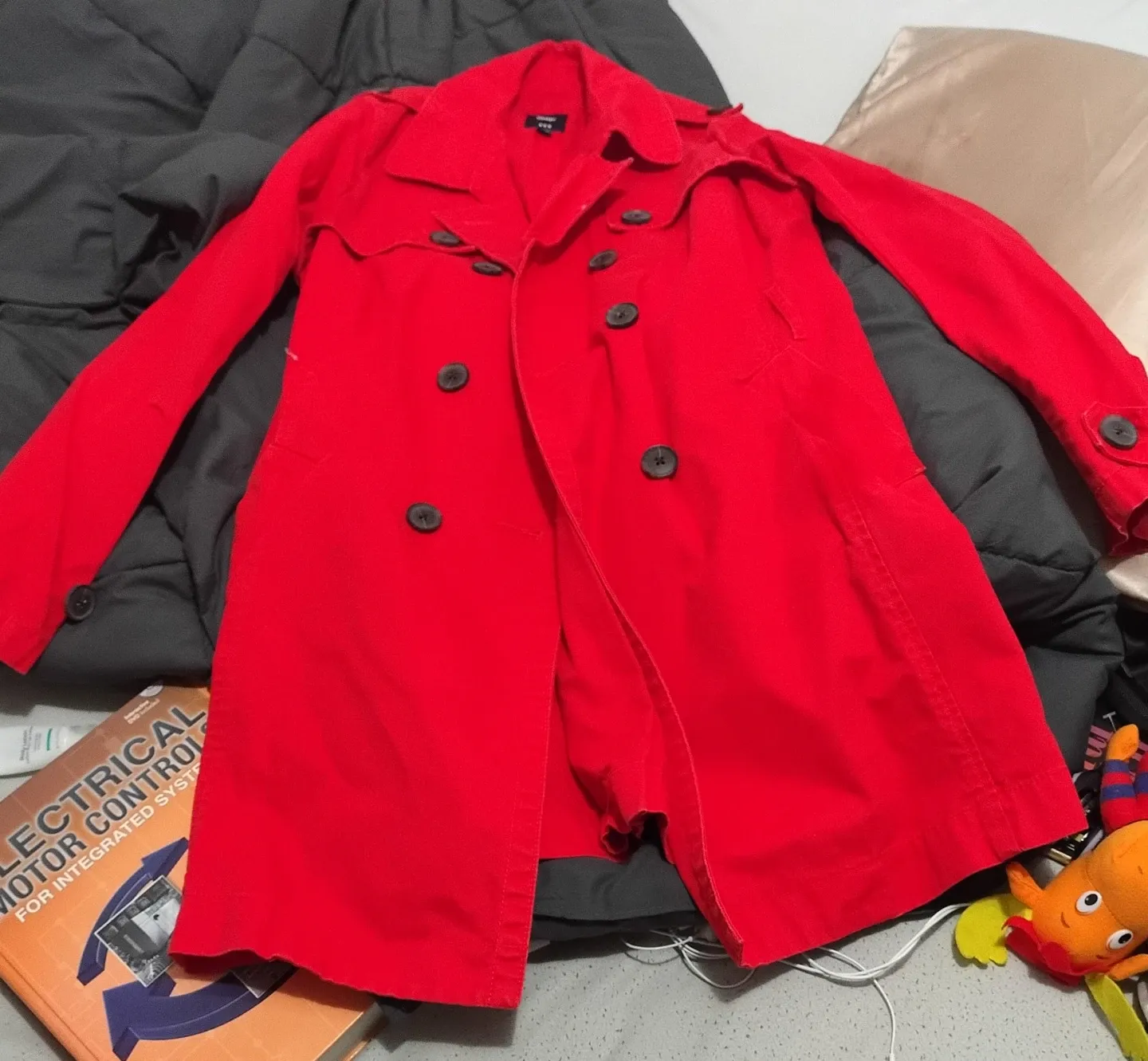 This is a bright red, double-breasted trench coat. It features classic button closures and a belted waist. Made from a durable cotton blend.