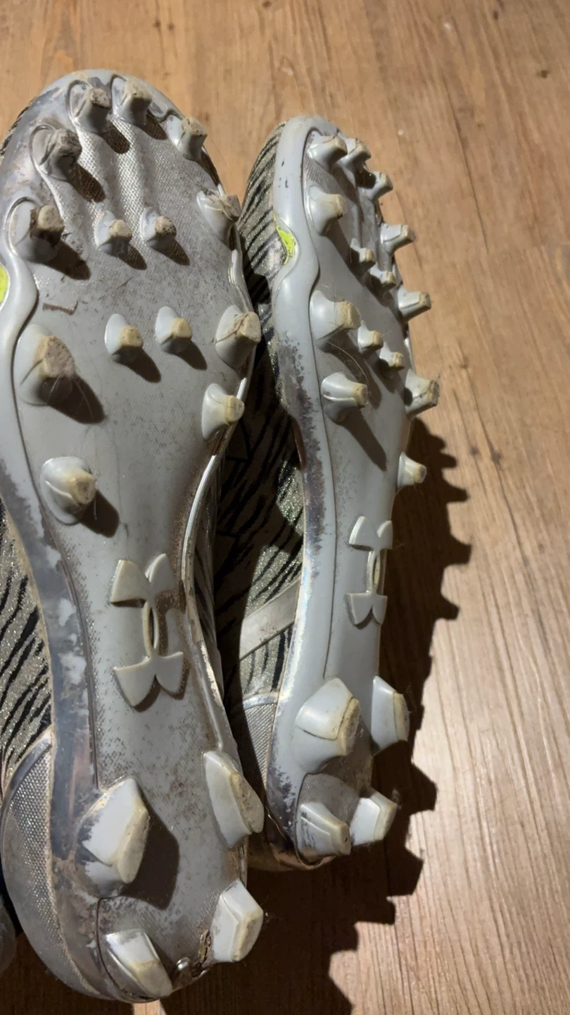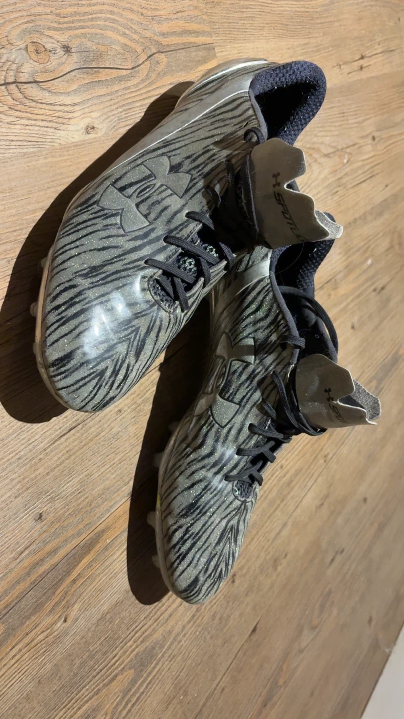 These Under Armour football cleats are a size 12. They feature a unique zebra-stripe design. Some dirt is present from use.