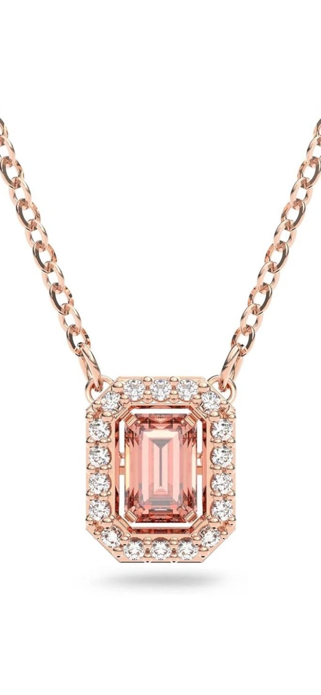 This is a Swarovski necklace featuring a captivating pink octagonal stone, embraced by a halo of sparkling pavé crystals, suspended from a delicate rose-gold tone plated chain.