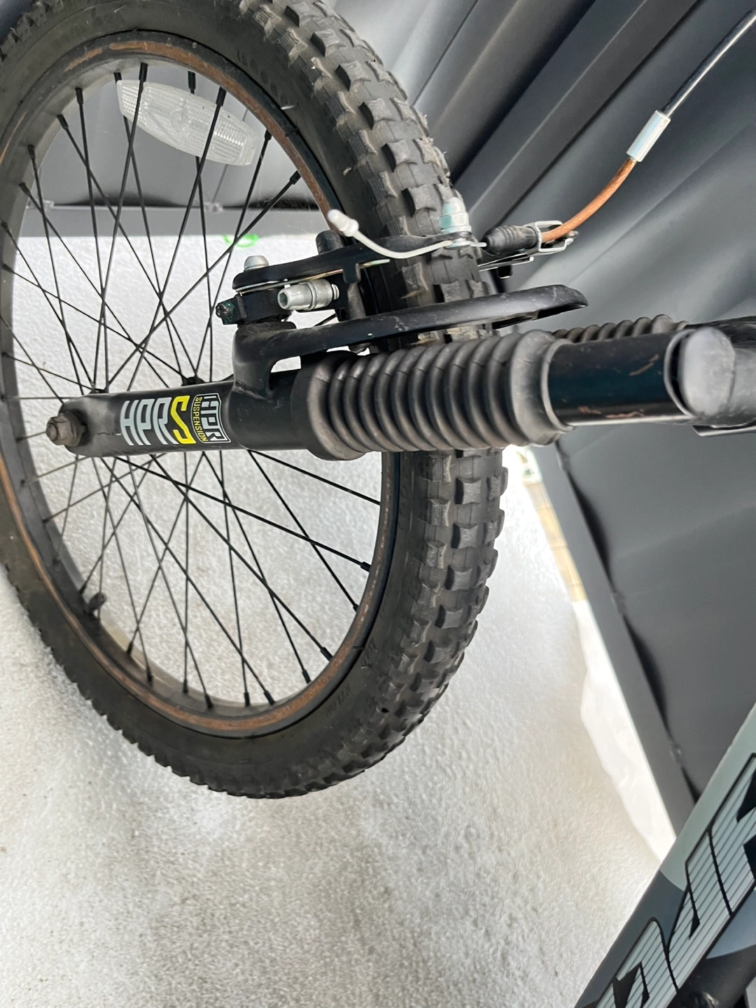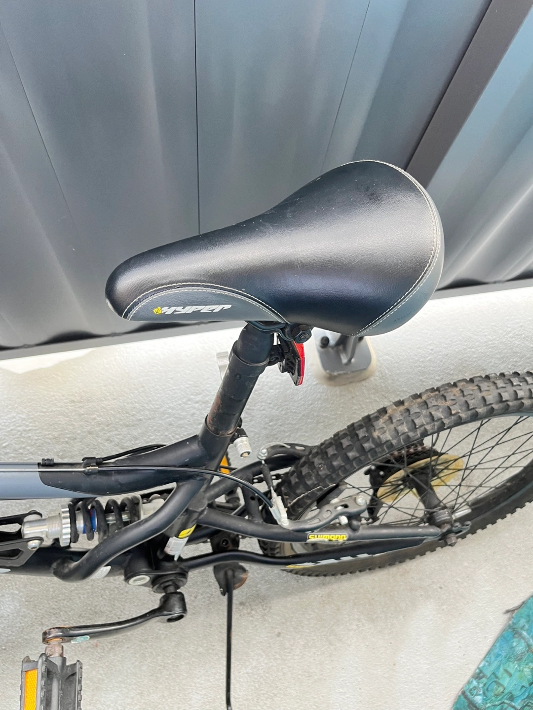 Used kids' mountain bike. Features suspension forks and rear shocks. Black and grey frame. Good for smaller riders. Some wear and tear.