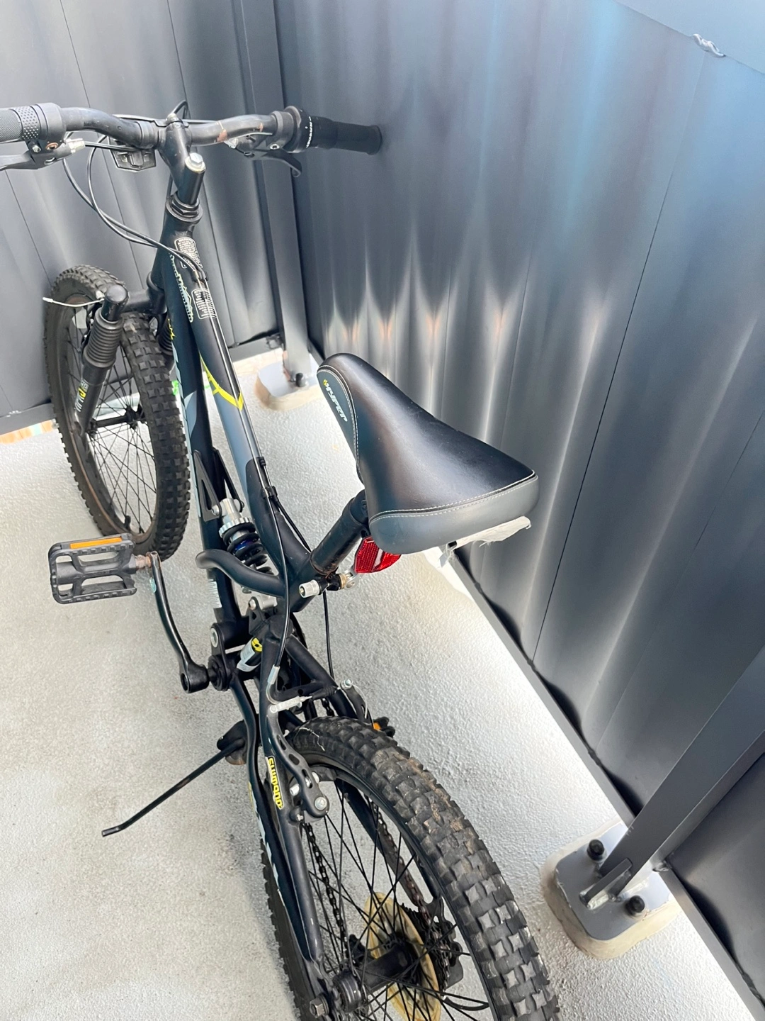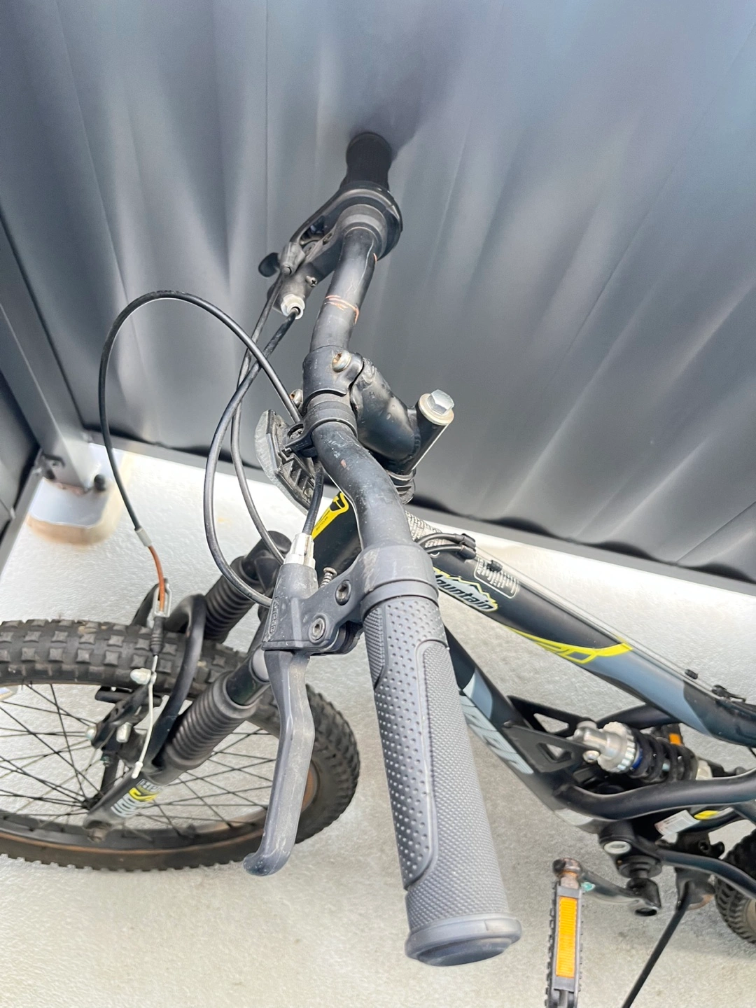 Used kids' mountain bike. Features suspension forks and rear shocks. Black and grey frame. Good for smaller riders. Some wear and tear.