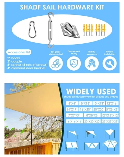 Adjustable Turnbuckle: The kit has adjustable turnbuckles to create tension to make your sails get tight in installation. The length of the turnbuckle can be adjusted from 4.75 inches to 6.5 inches.