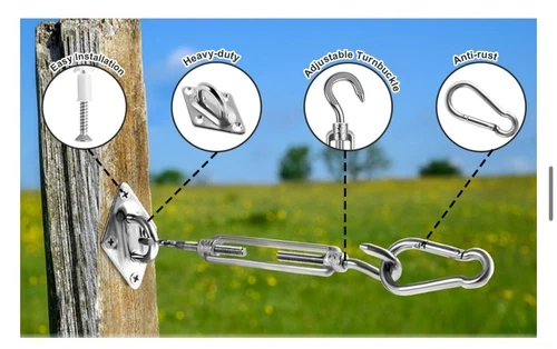 Easy to Install: Convenient and easy to install. Use a manual or electric screwdriver to fix the pad eyes at the selected points. Then select turnbuckles or snap hooks to connect pad eyes and shade sail. You can install your sail shade hardware between trees, walls or wherever you want.