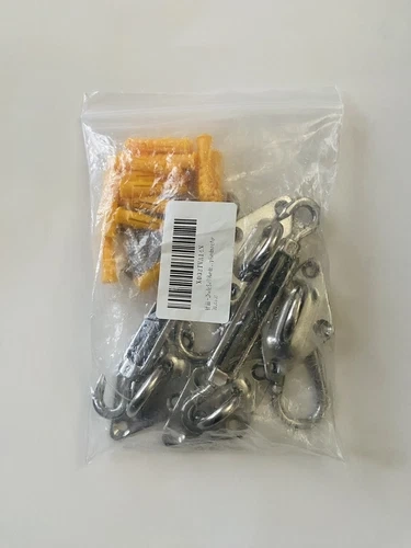 What You Get: The kit includes 2 adjustable turnbuckles, 2 snap hooks, 4 pad eyes, 16 phillips head helical spiral threads screws and 16 expansion bolts.