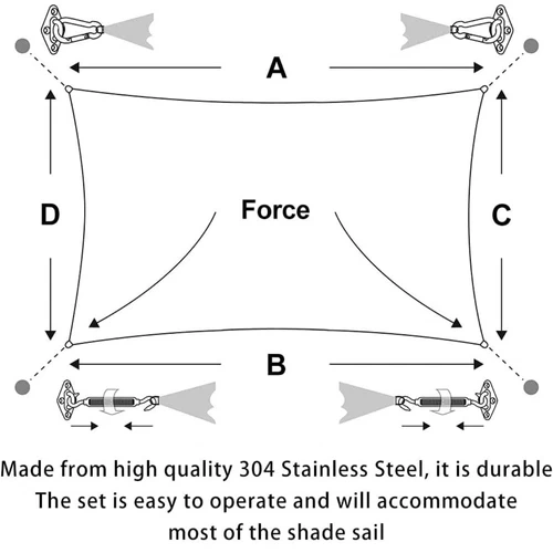 Adjustable Turnbuckle: The kit has adjustable turnbuckles to create tension to make your sails get tight in installation. The length of the turnbuckle can be adjusted from 4.75 inches to 6.5 inches.