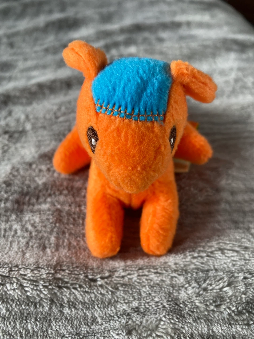 This is a small (4 inches long), orange plush toy with a bright blue accent on its head. It has embroidered eyes and nose. Its tail is curled. This plush toy is soft to the touch.