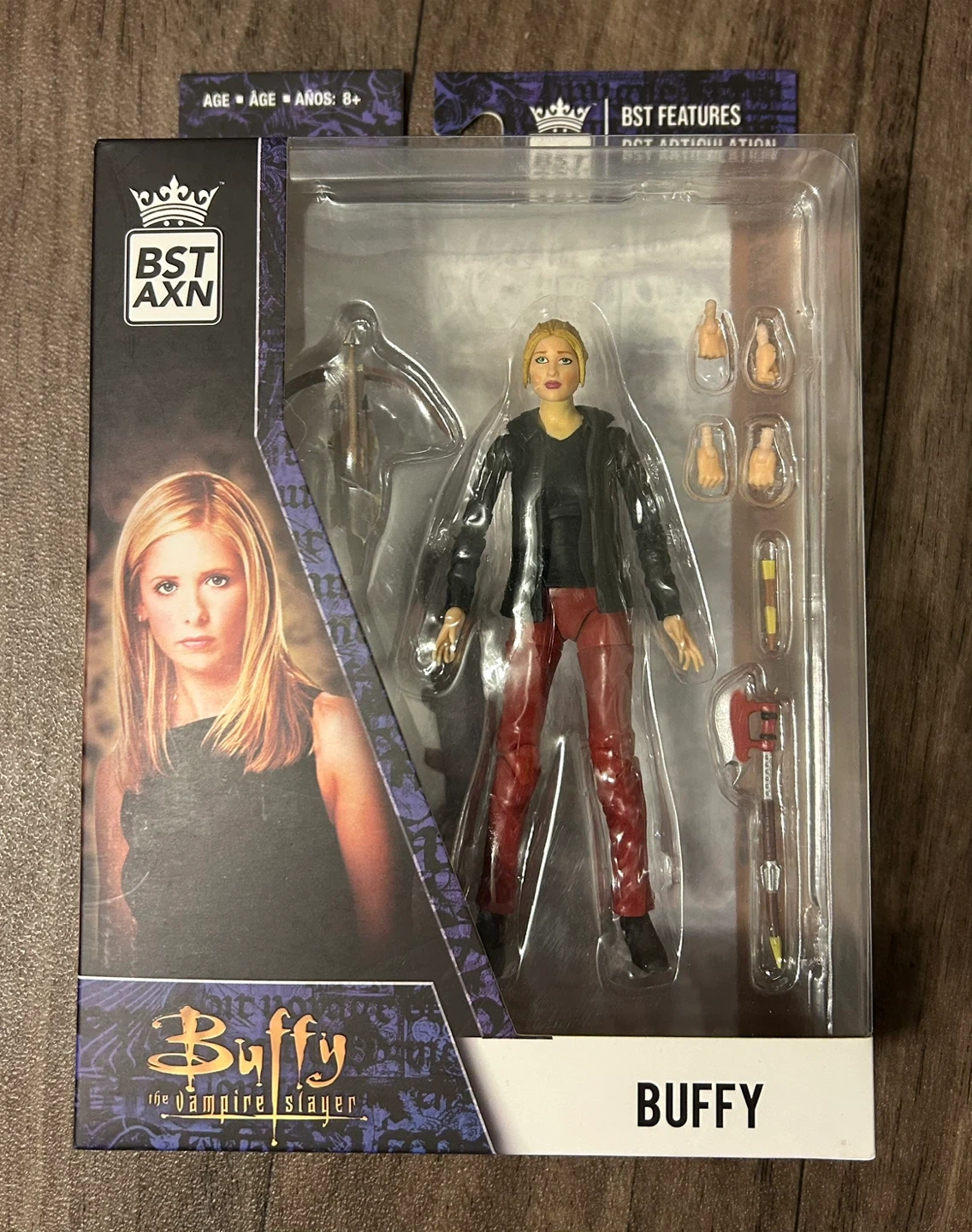 This is a Buffy action figure from Buffy the Vampire Slayer. It features BST AXN articulation and comes with multiple accessories. Recommended for ages 8 and up.
