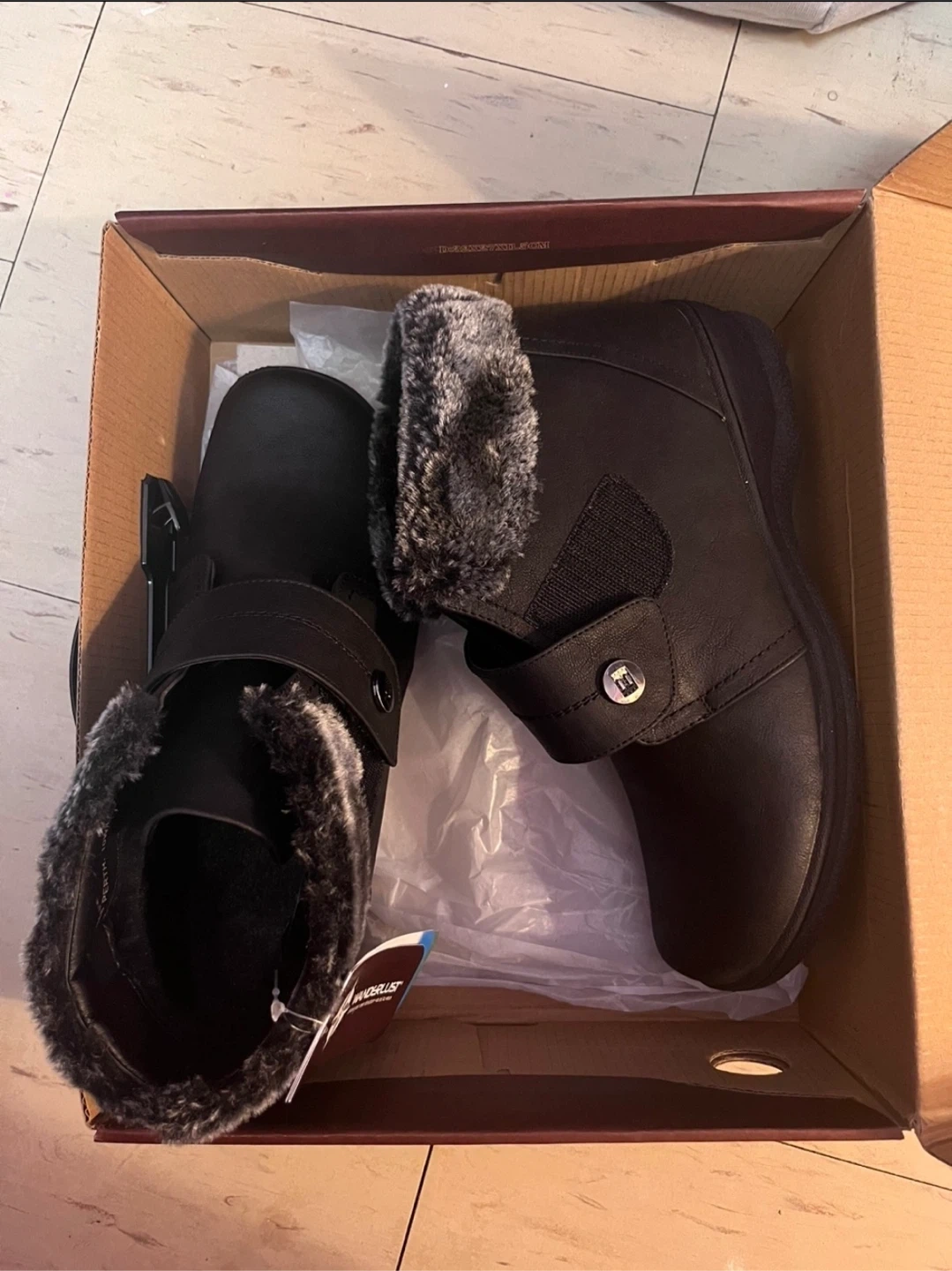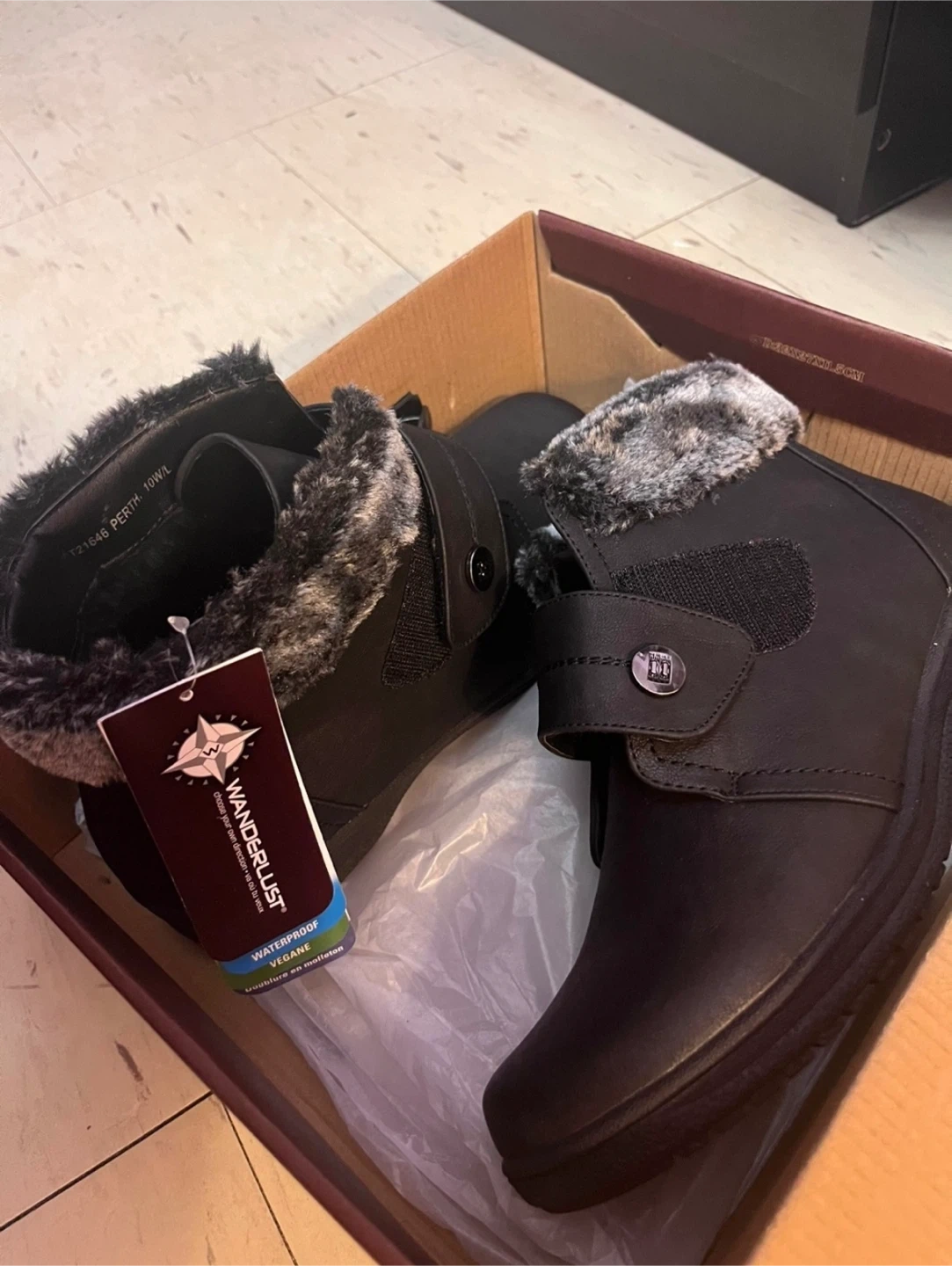 These black Wanderlust boots are waterproof and vegan. They feature a comfortable faux fur lining and a secure strap closure. Perfect for keeping your feet warm and dry in cool weather!