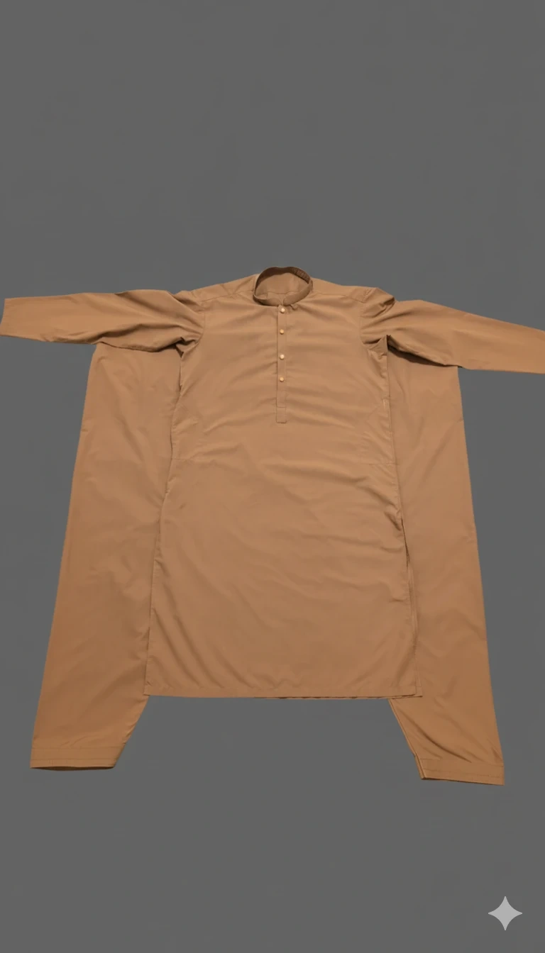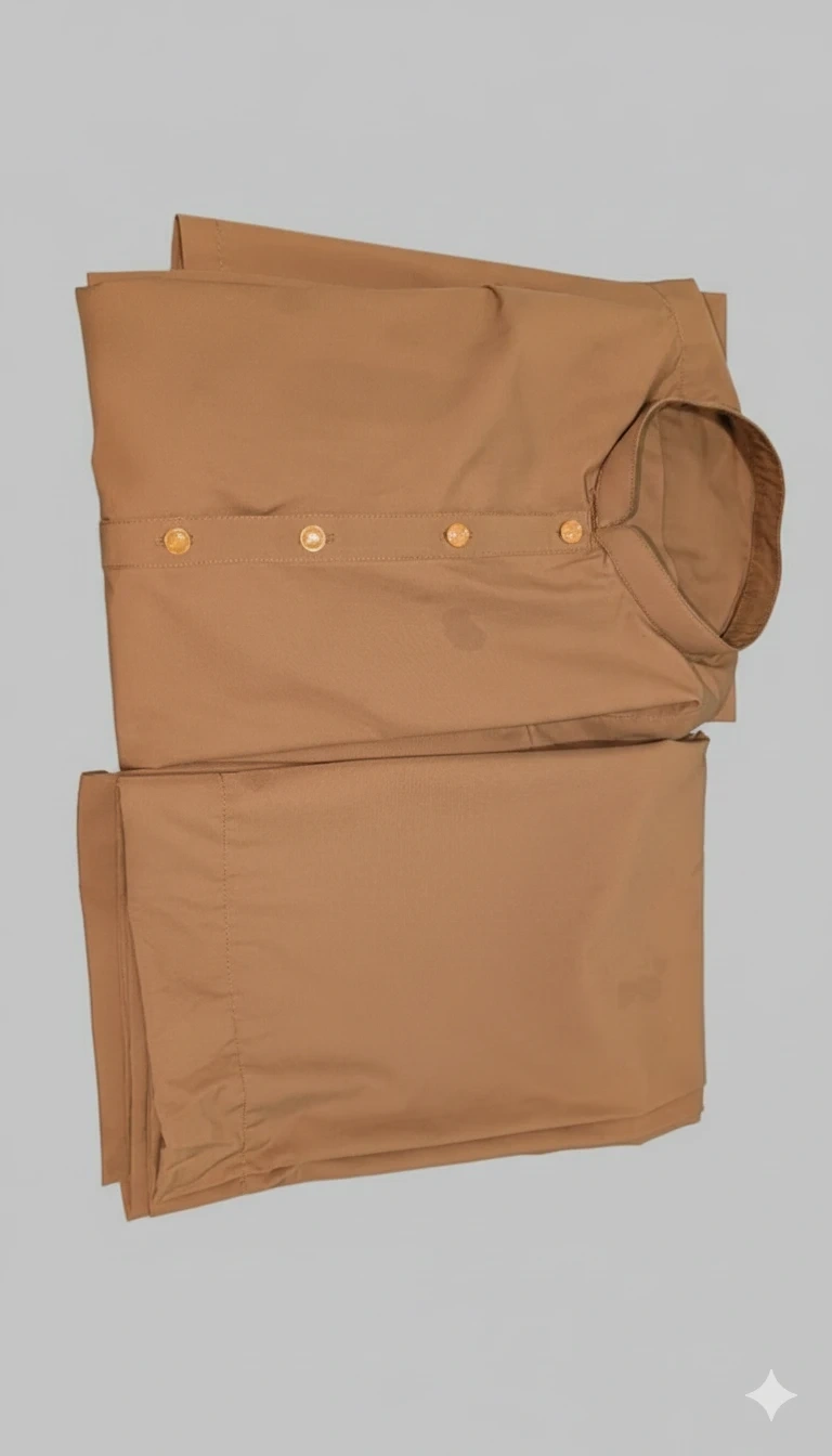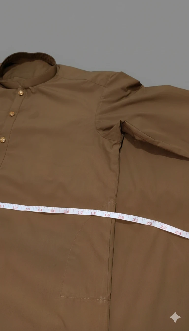 Selling a brown kurta, perfect for a relaxed yet stylish look! The kurta has a mandarin collar with button detailing, and the pajama pants are comfortable and easy to wear. The measurements in the photos should help you get a sense of the size! Barely any stains. Used once, so it's like new.