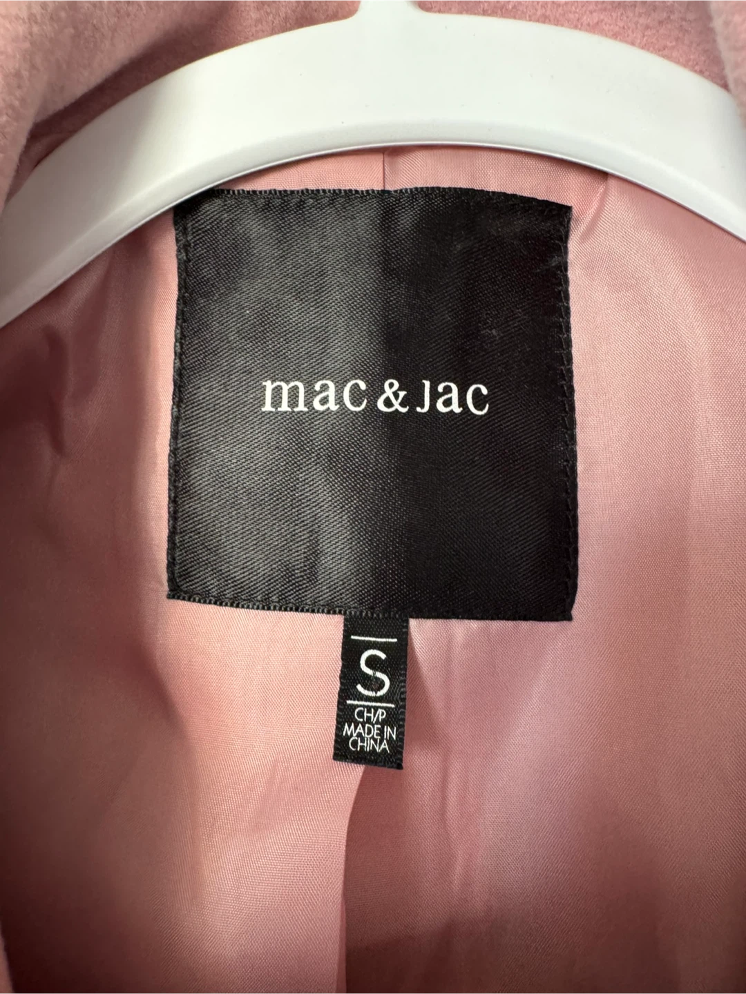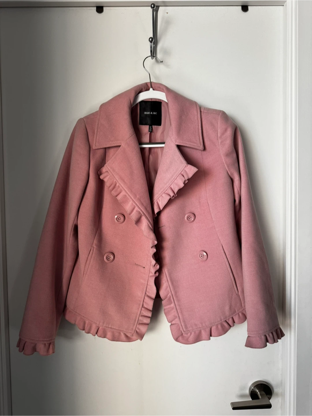 This is a stylish pink pea coat from Mac & Jac. It features double-breasted buttons and a lovely ruffled trim. It's a size small.