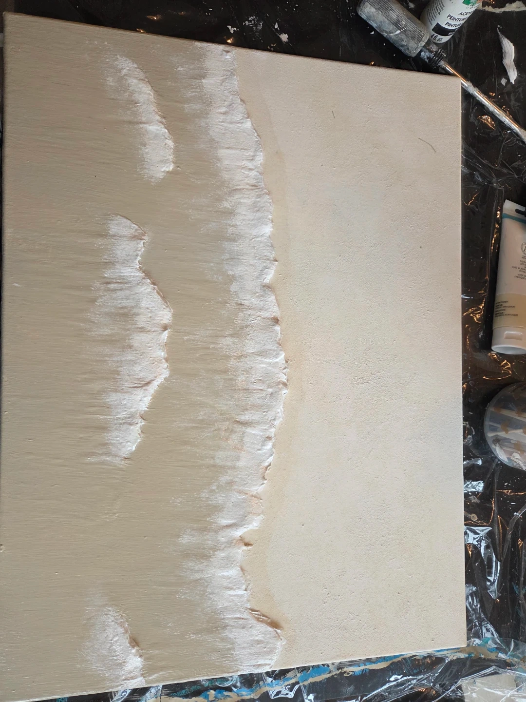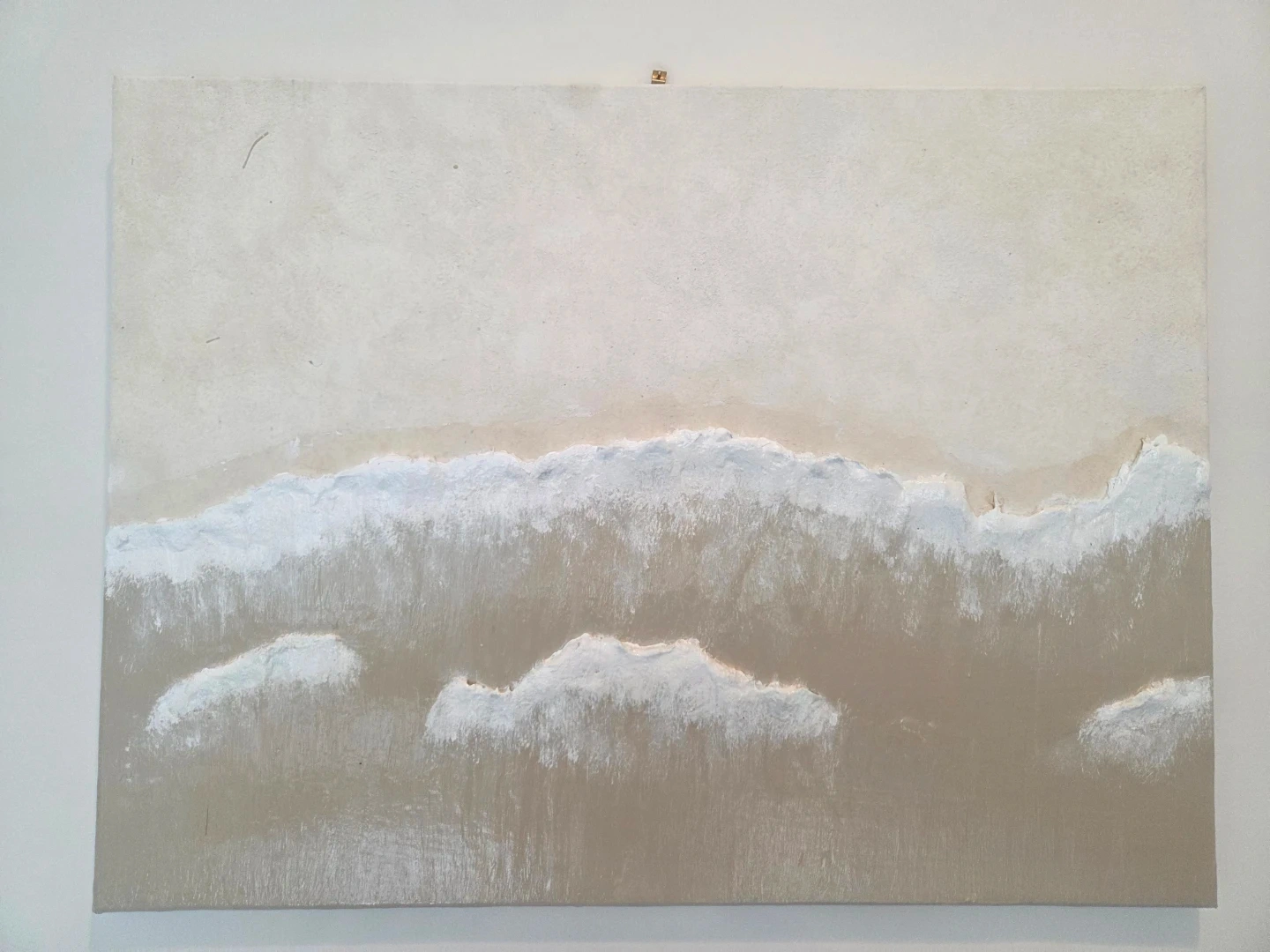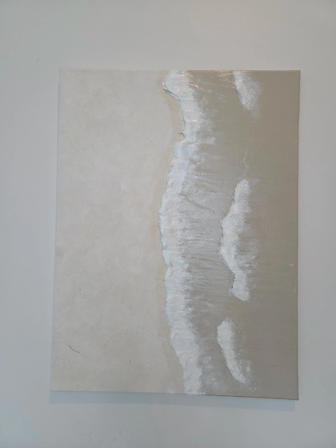 Canvas art with a textured abstract design of beach waves. Neutral beige and white tones. It's a unique piece to add to your decor.