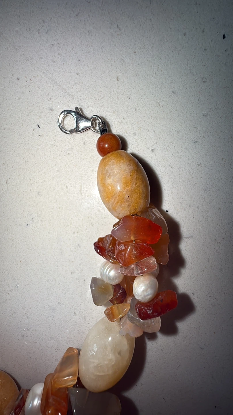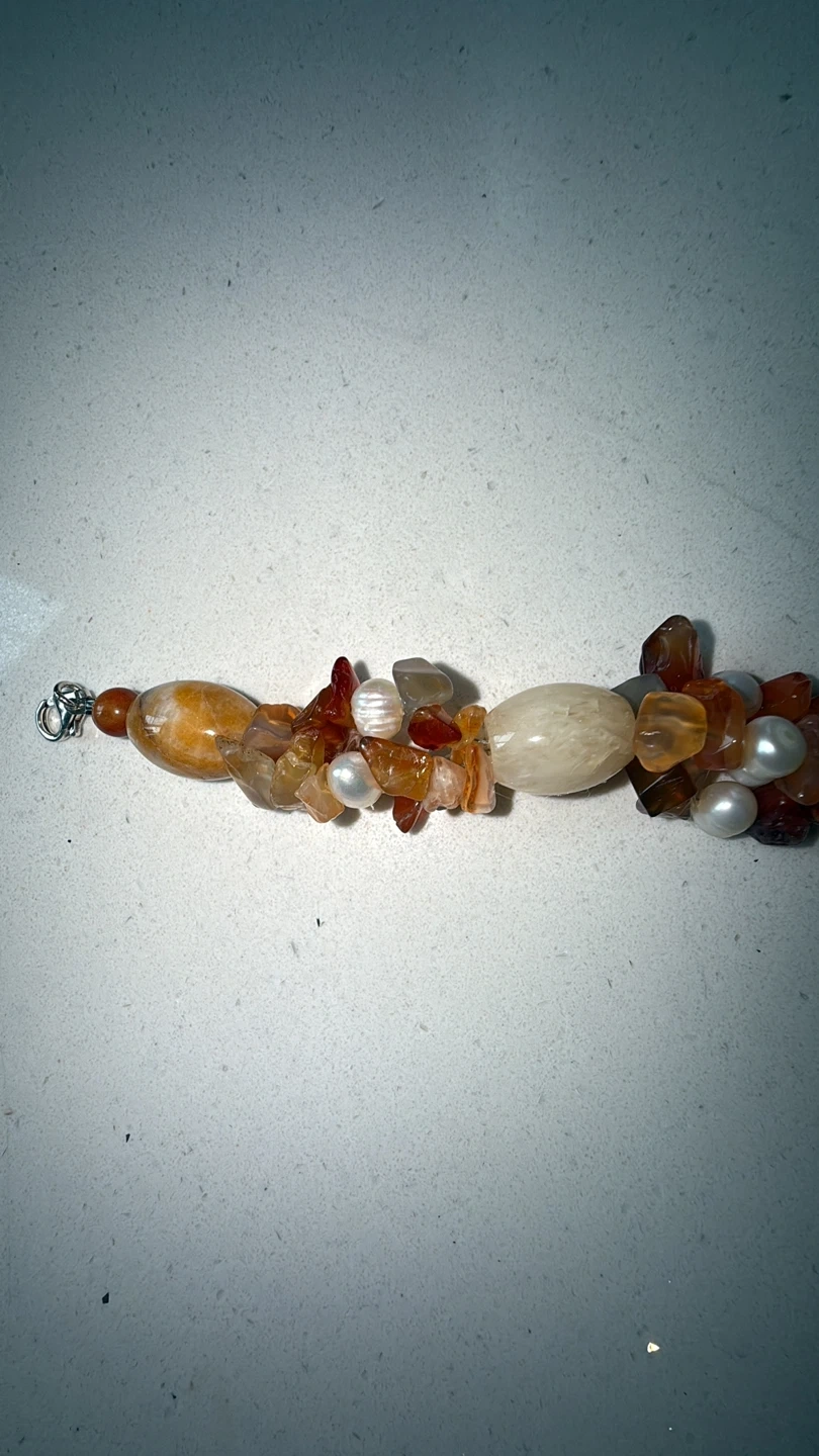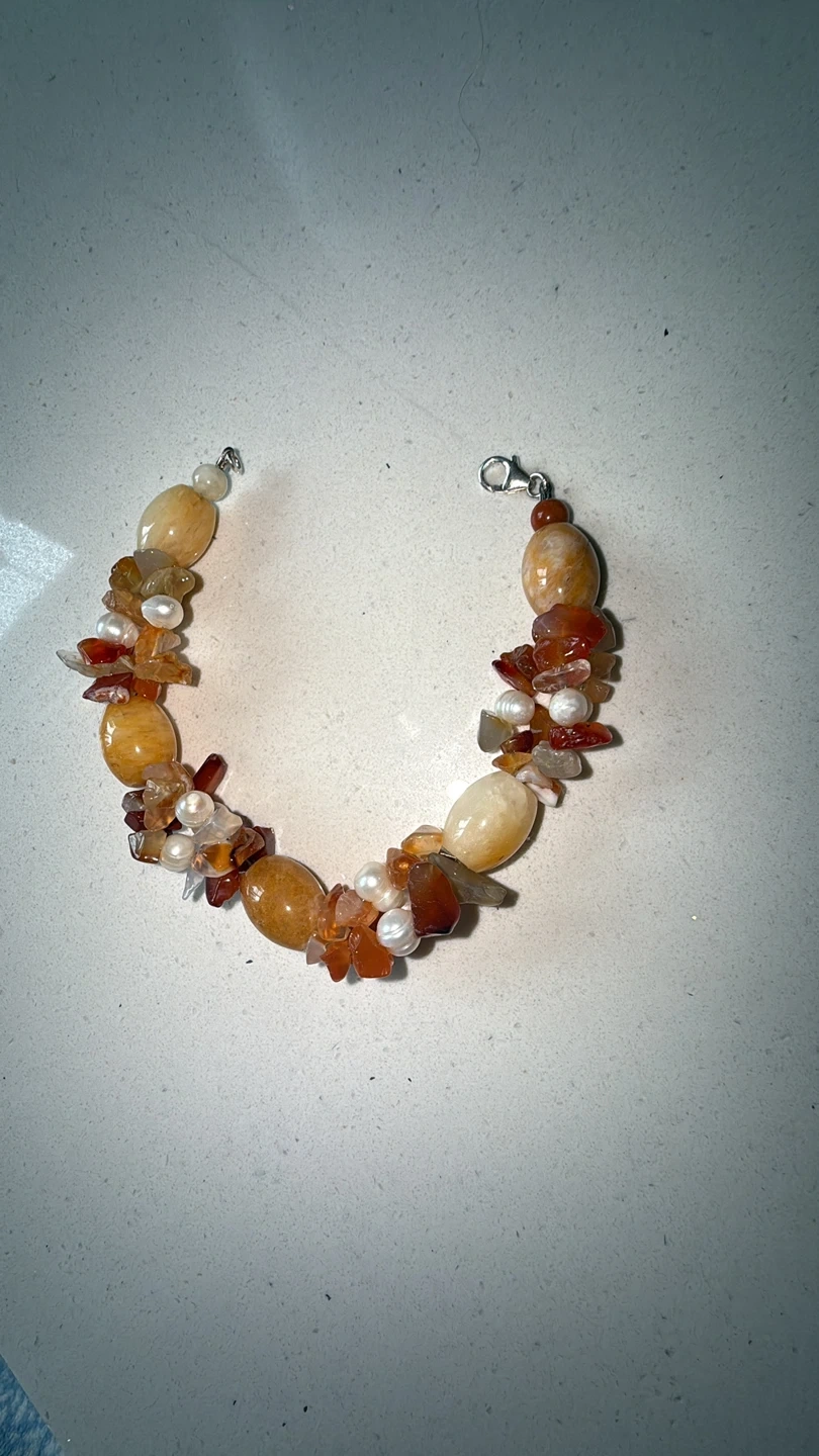 This elegant, Precious stones bracelet has Genuine Carnelians, 6.0 mm freshwater Pearls and others. Has a 925 Stamped clasp closure.as well.
