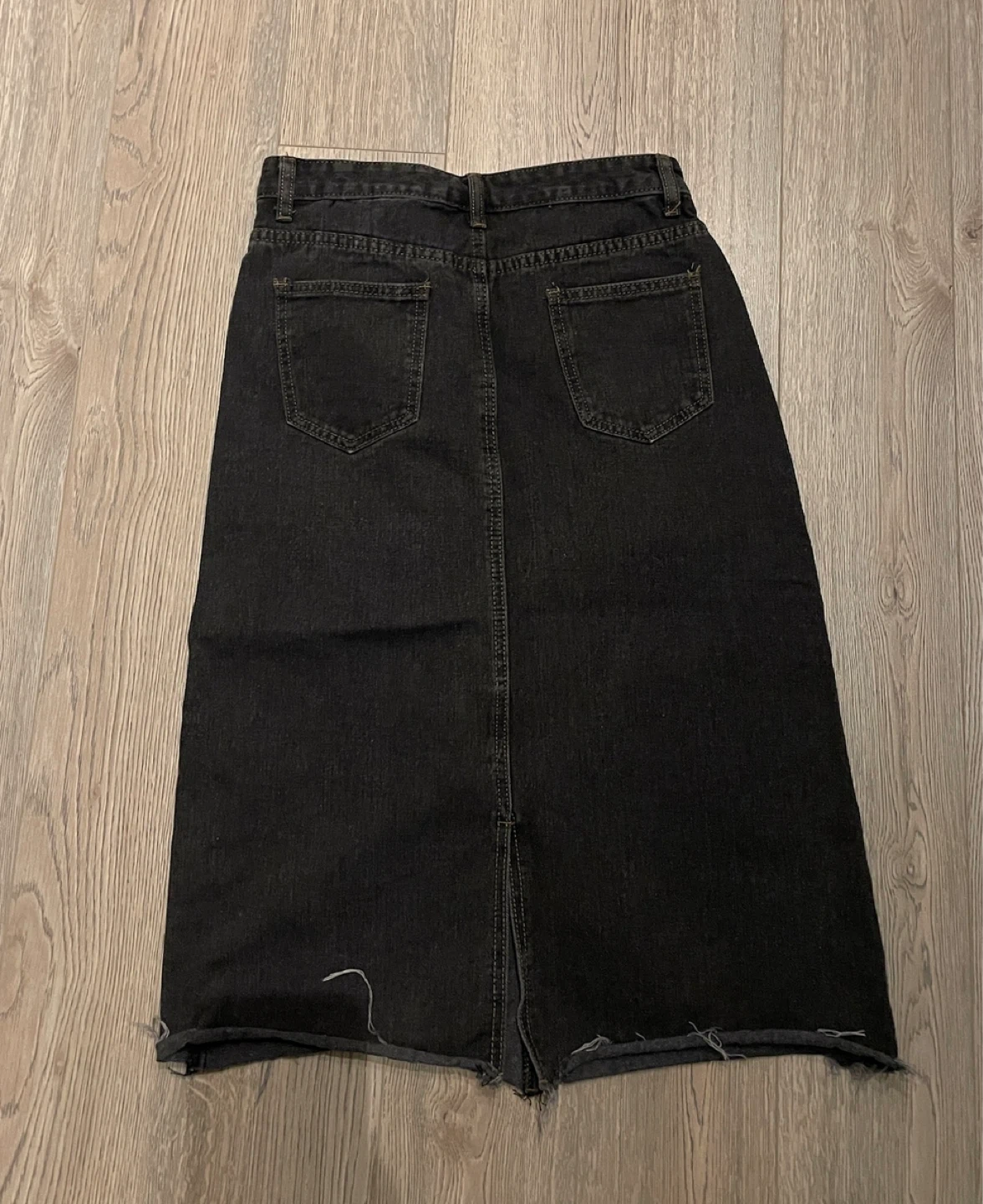 Here's a stylish dark grey denim midi skirt! It's in great condition and ready for a new wardrobe. The skirt is made of denim material and features a classic midi length. Perfect for casual outings or dressing up with a cute top!