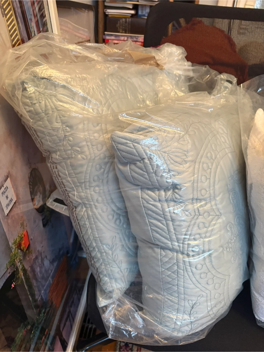These light blue quilted throw pillows come as a set of two. They feature a delicate embroidered floral and geometric pattern. The pillows appear to be a standard decorative size. One of them needs to be sewn up a bit on the edge. Free pickup near Bathurst station.