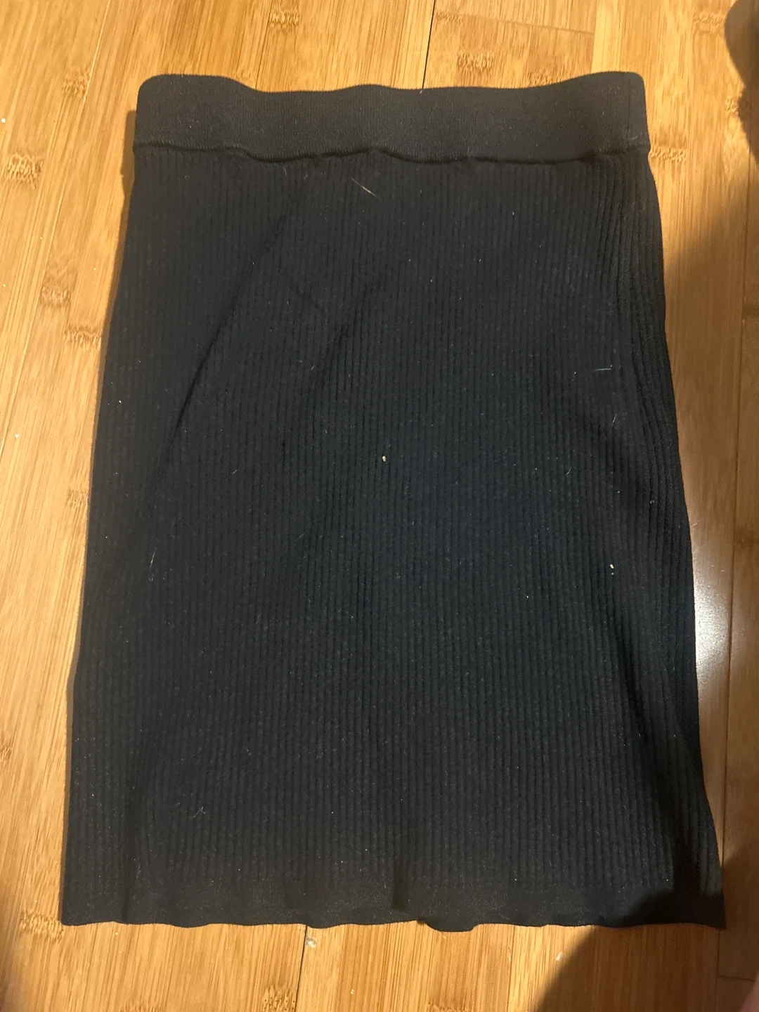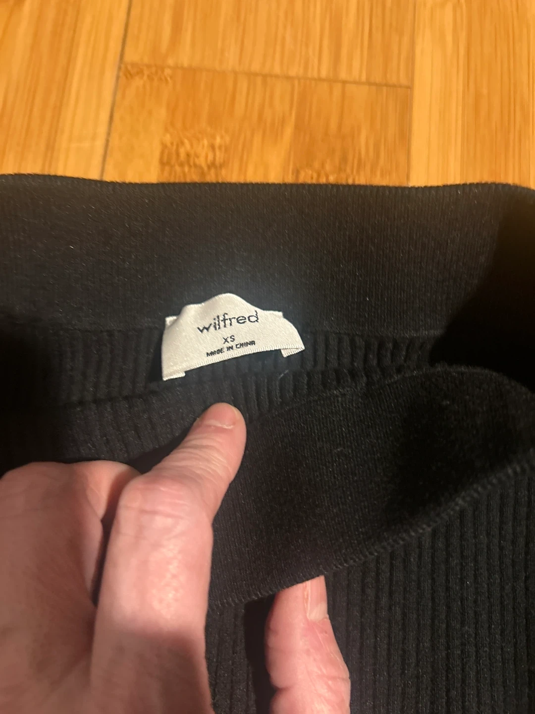 This is a black ribbed knit mini skirt from Wilfred. It's a size XS. Great for layering or wearing on its own!