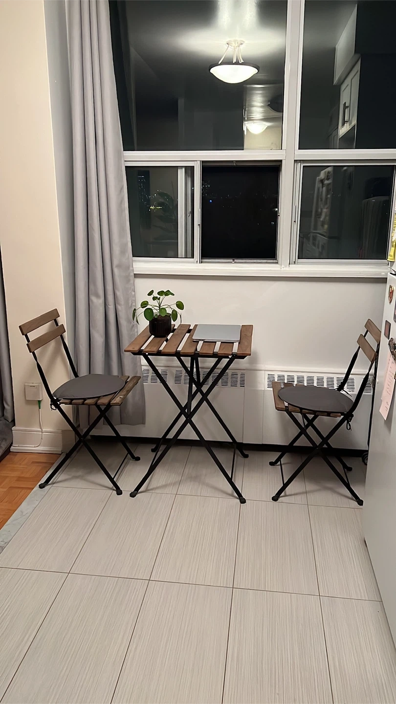 Compact and convenient folding bistro set, perfect for small spaces. Features a wooden tabletop and metal frame. Includes two chairs with grey seat cushions and one folding table. Easy to set up and store away!