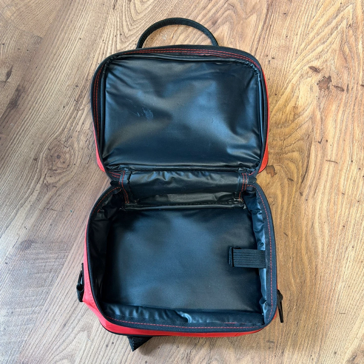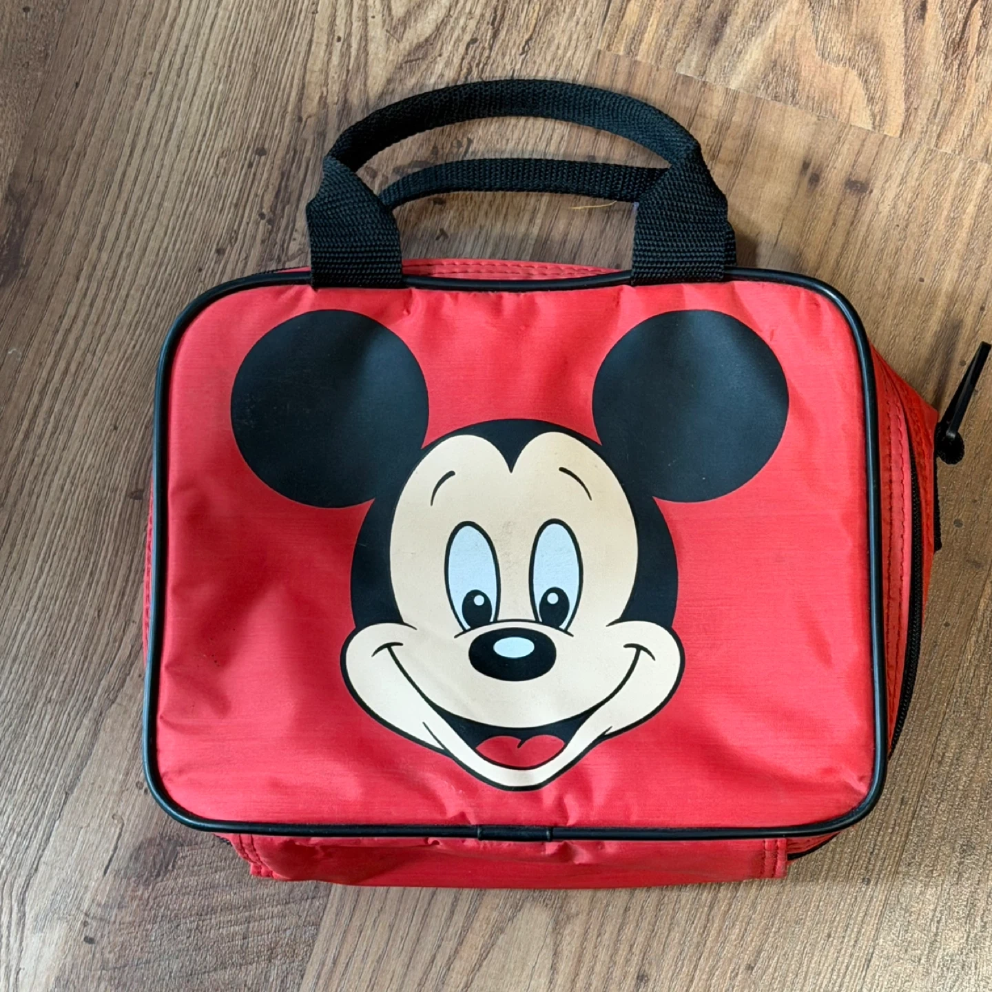 Red and black insulated lunch bag featuring Mickey Mouse graphics. It has a zippered closure and a top handle for easy carrying. Perfect for packing snacks or a lunch!