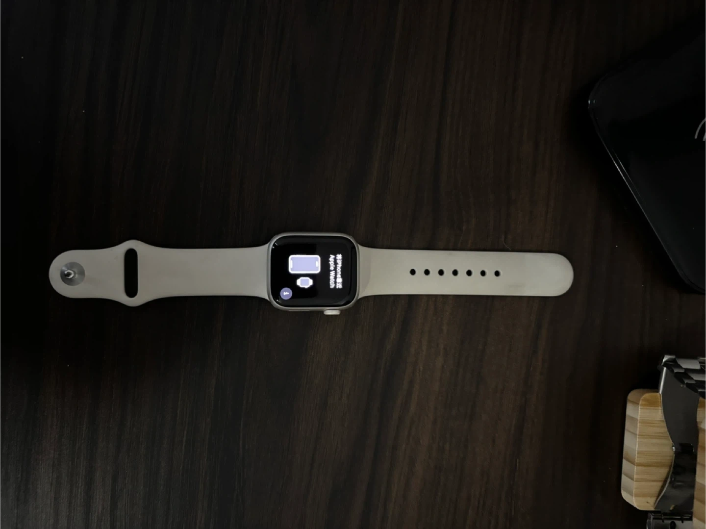This is a used Apple Watch Series 7. It's a smart timepiece with a digital display and comes with a white band. Works great!