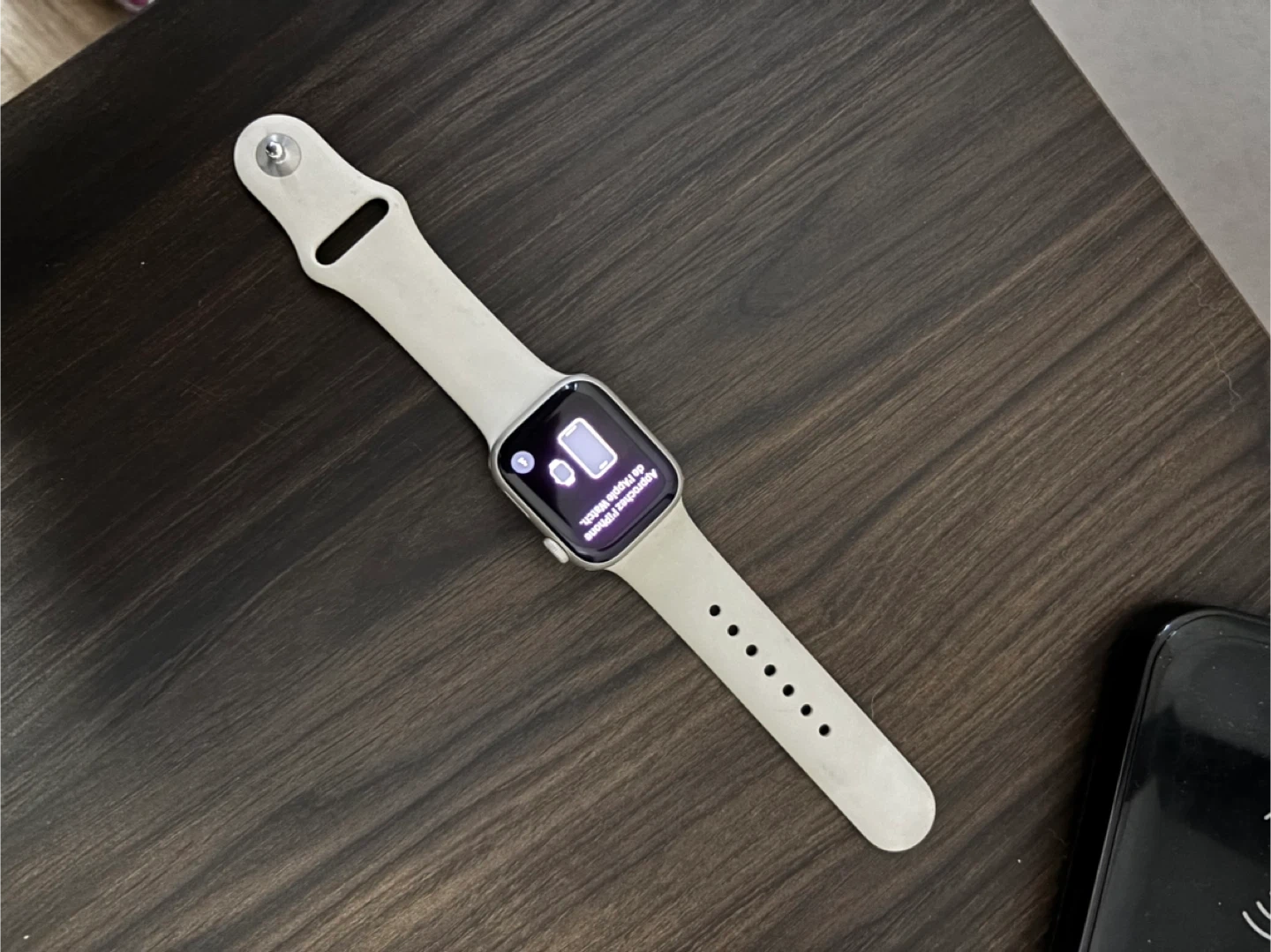 This is a used Apple Watch Series 7. It's a smart timepiece with a digital display and comes with a white band. Works great!