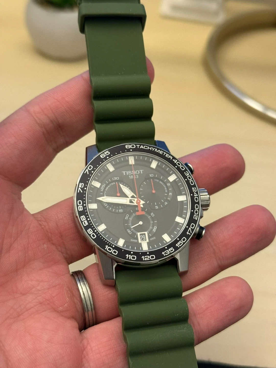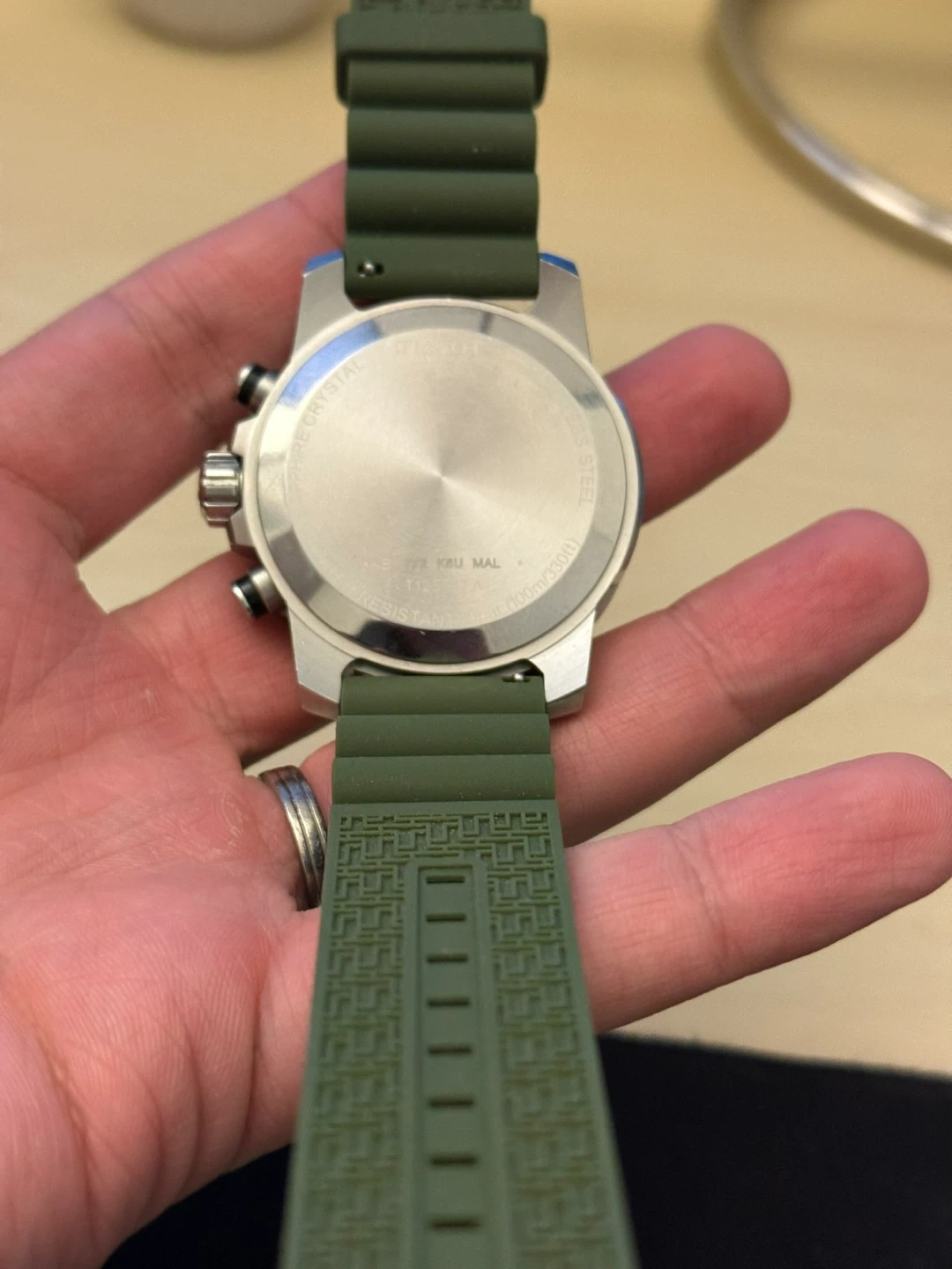 This Tissot watch features a chronograph function and a stainless steel case with a black rubber strap, brown or green (or al together)