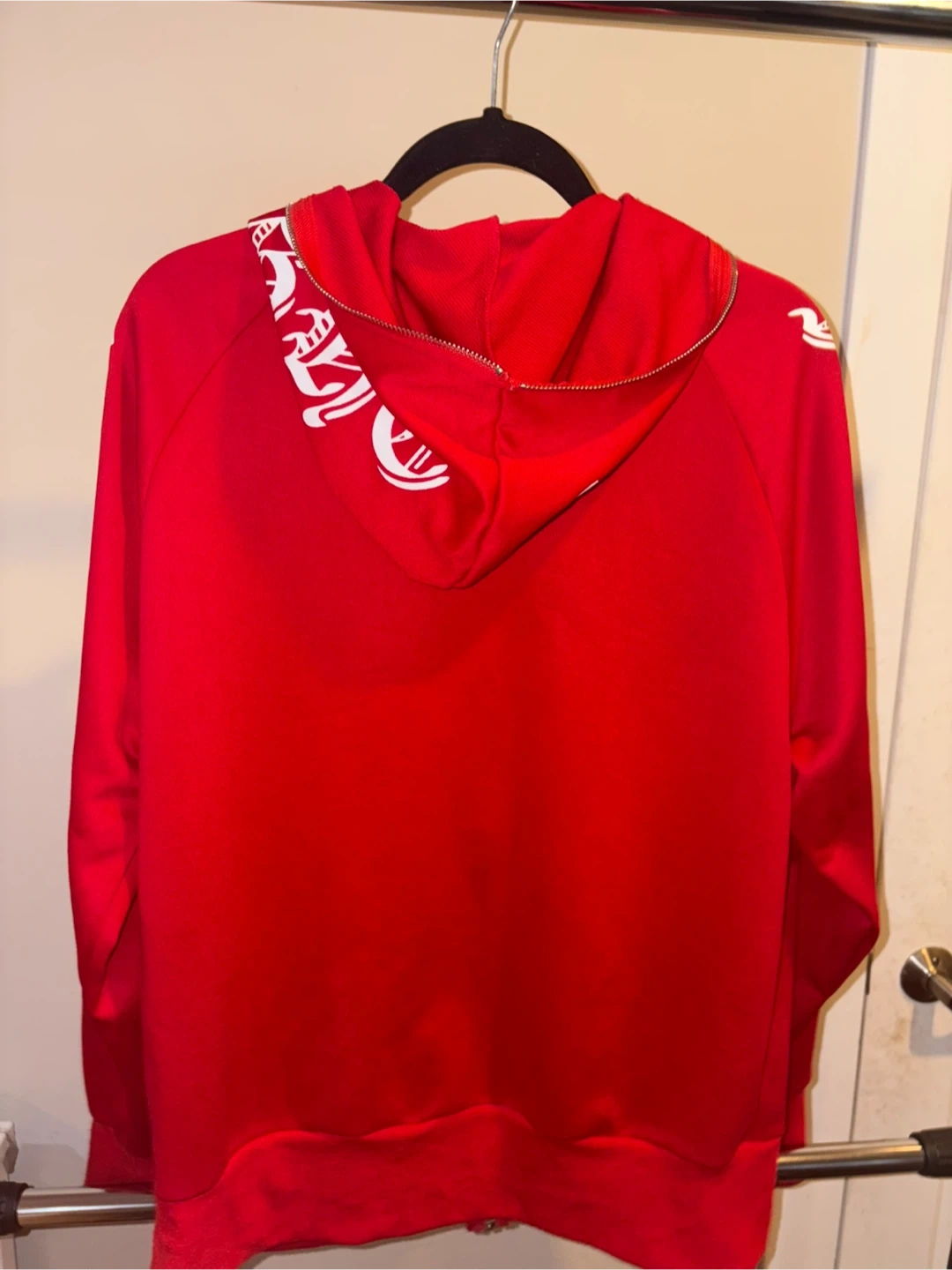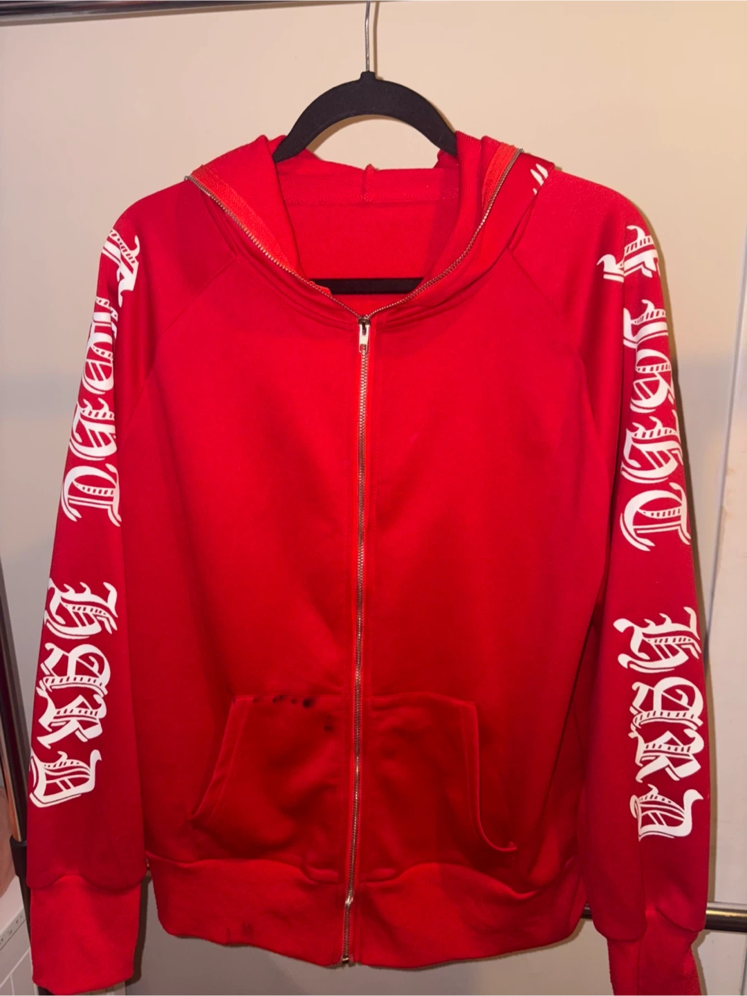 Red zip-up hoodie with white graphic text down both sleeves. Comfortable fit with front pockets and hood. Good condition overall with normal wear. Clean and ready to wear.