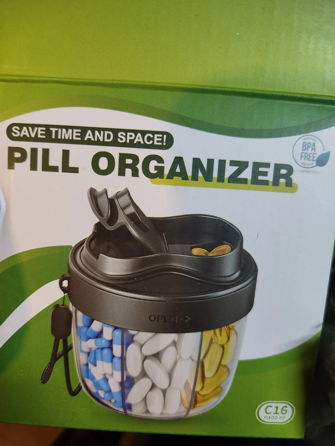 This pill organizer is designed to save time and space. It's made from BPA-free plastic and features multiple compartments for organizing your medications. The lid opens easily, and it includes a small carrying strap.