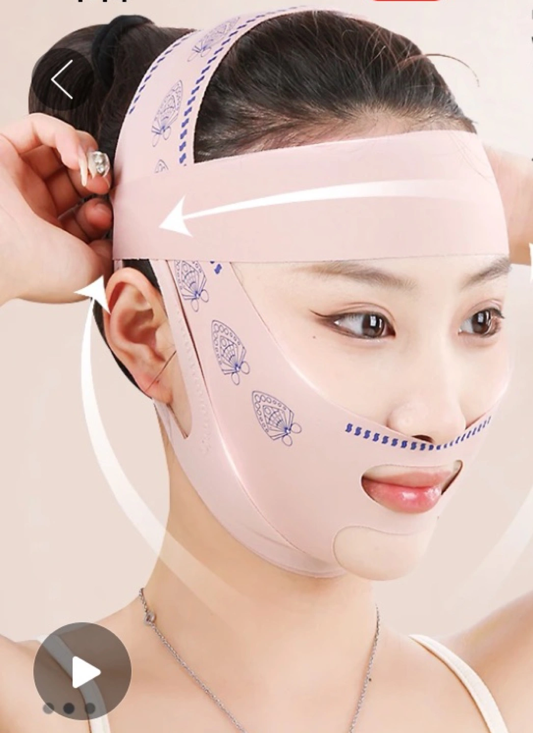 Reusable face mask. Features adjustable straps and breathable material. Designed to lift and shape the face. Cute butterfly pattern. Firming face-lifting magic tool, nasolabial bandage, day and night lifting, double chin, sleeping face sculpture, sagging, special nasolabial mask