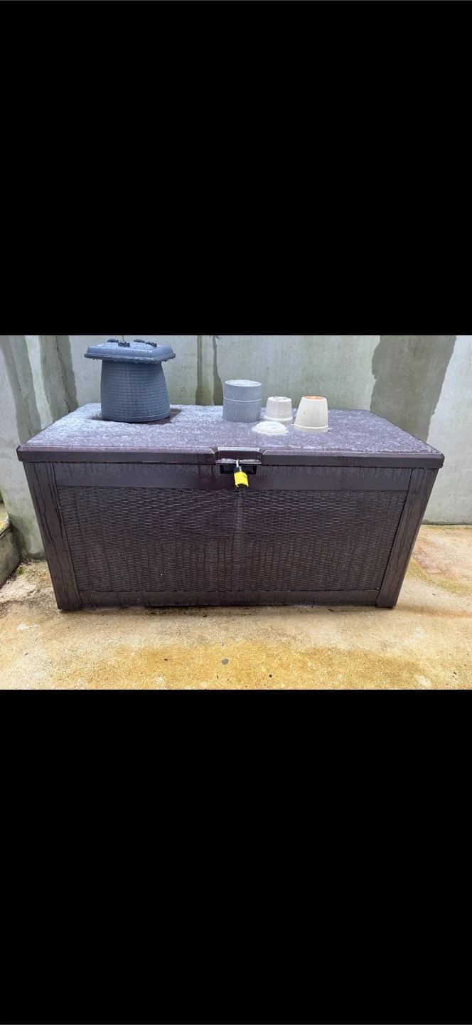 Spacious dark brown storage box with a rattan-style weave. It features a lockable lid for added security. Great for storing garden cushions or outdoor equipment.