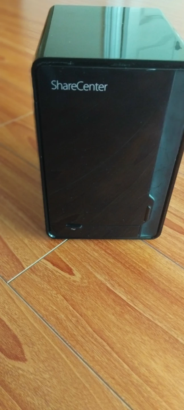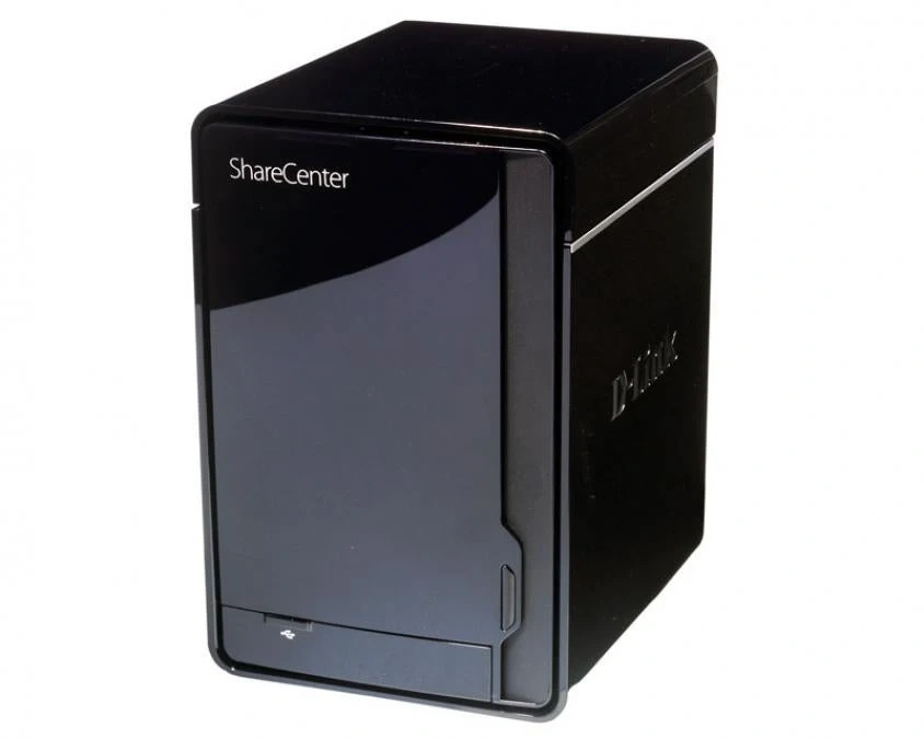 D-Link ShareCenter network attached storage device. Black plastic casing. This unit is designed to hold hard drives for network storage. Requires internal hard drives to operate.