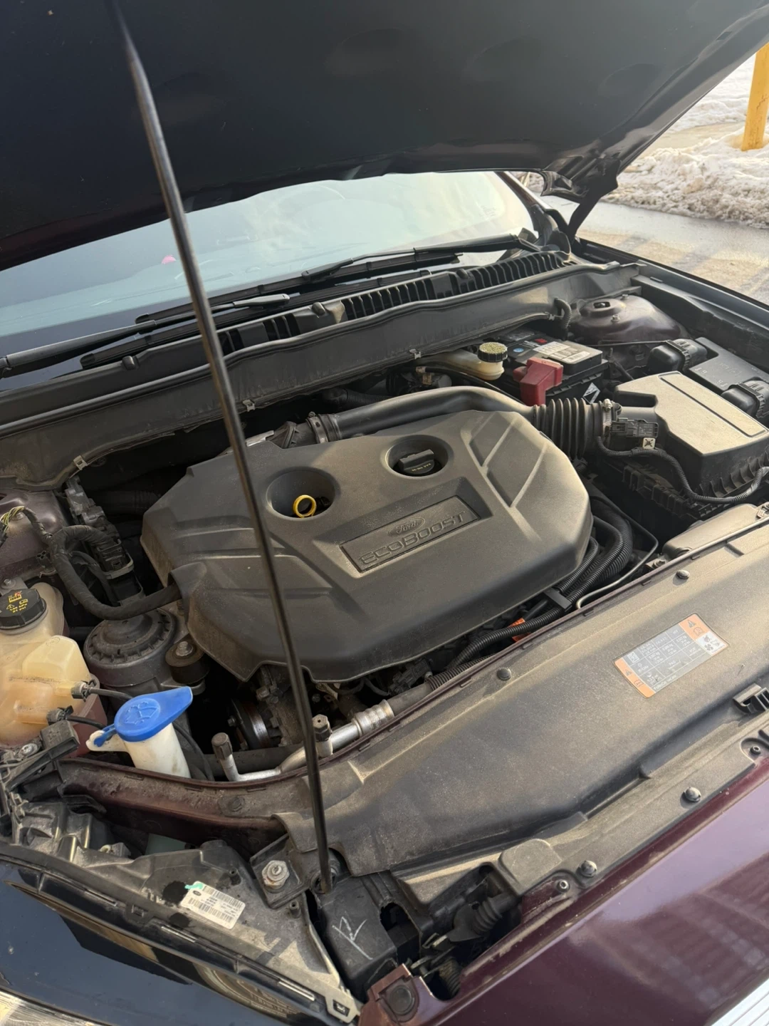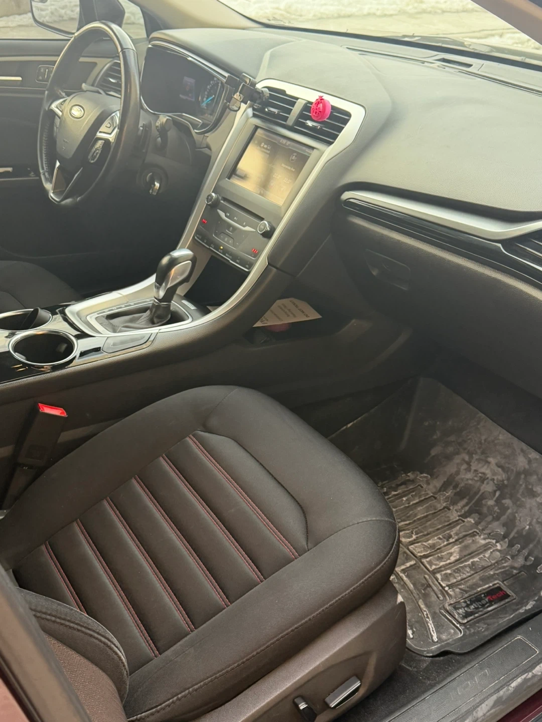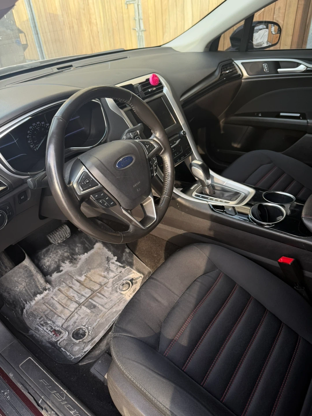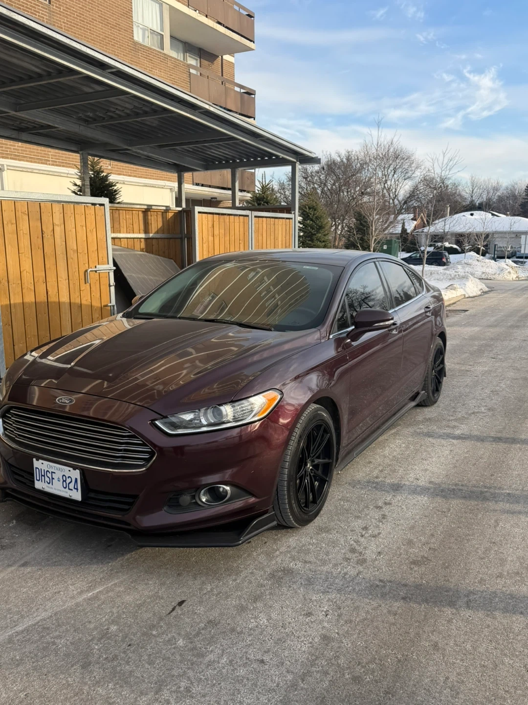 This is a Ford Fusion sedan in a deep burgundy colour. It's equipped with black rims and red brake calipers. Tires are Michelin brand.