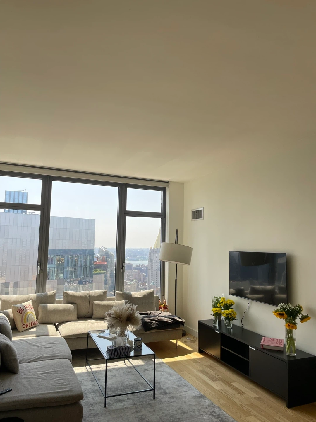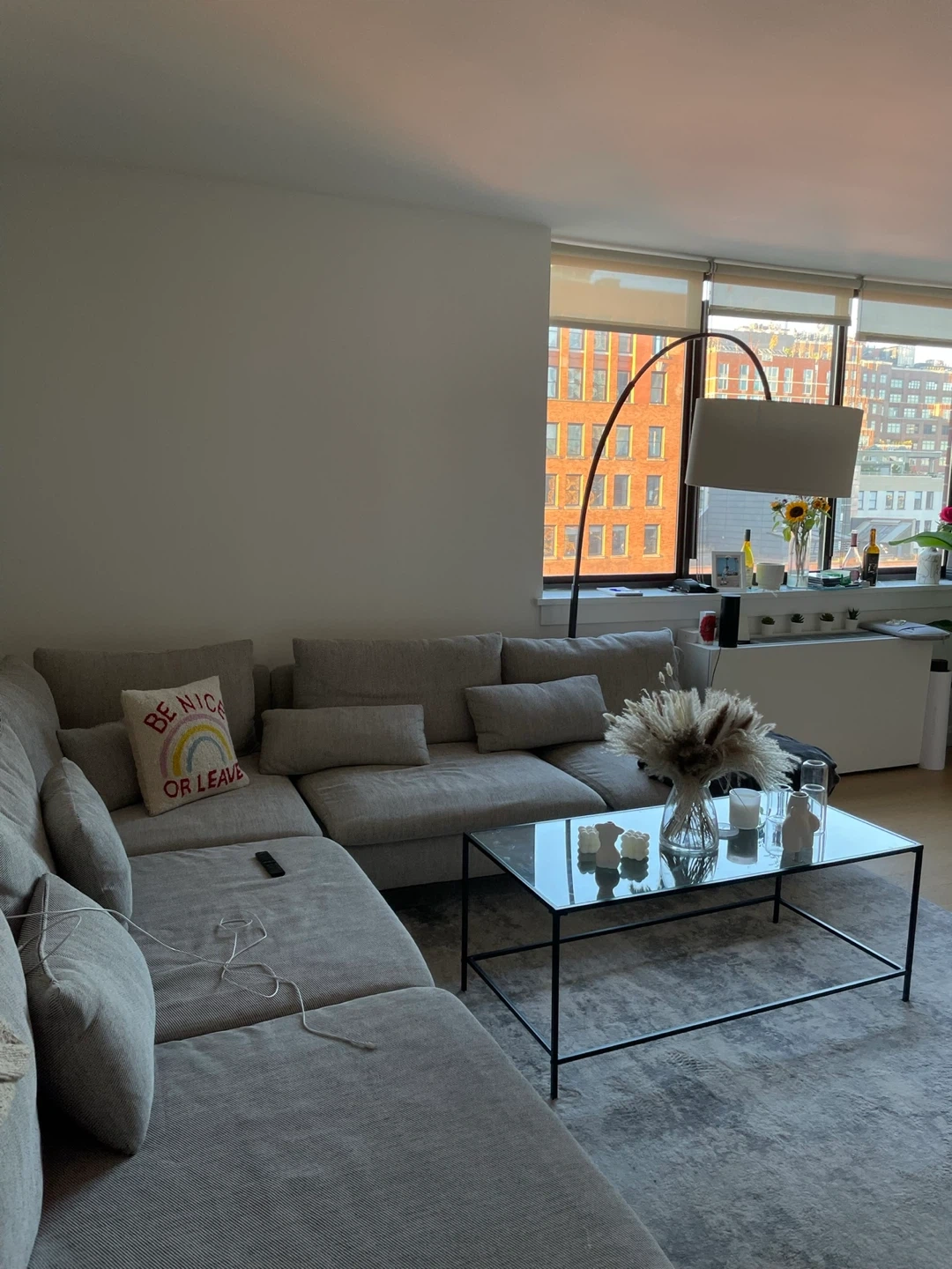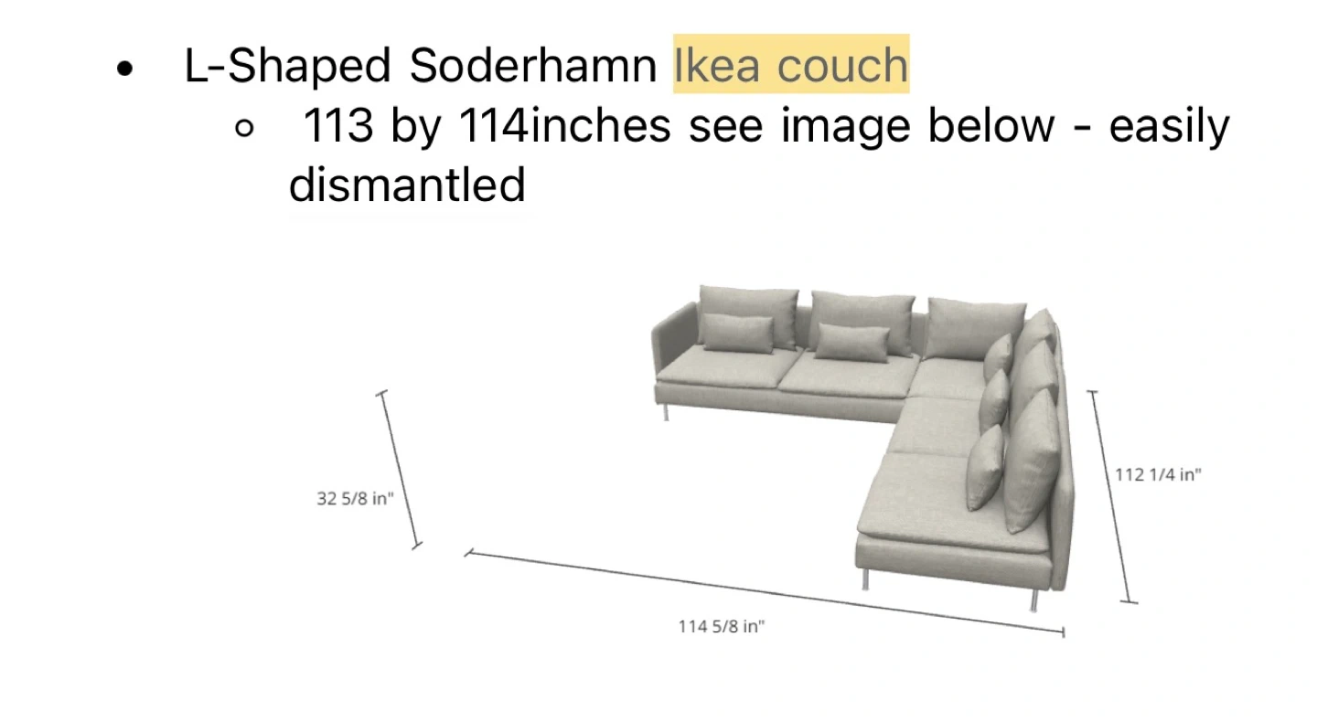 This is an L-shaped Soderhamn sectional couch from Ikea. It's upholstered in a light gray fabric. It measures 114 5/8 inches by 112 1/4 inches. It's easily dismantled for transport.
