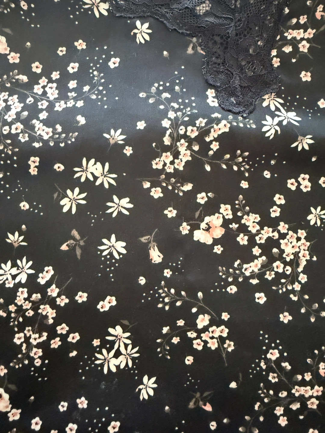 Black satin pajama set with a ditsy floral print and black lace trim. Includes a cami top with adjustable straps and matching shorts. Size is small. In excellent condition.