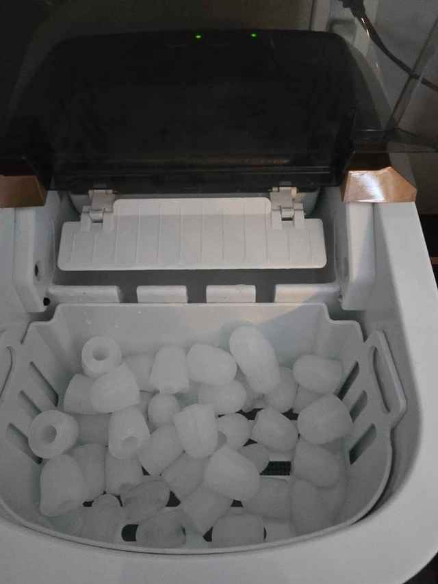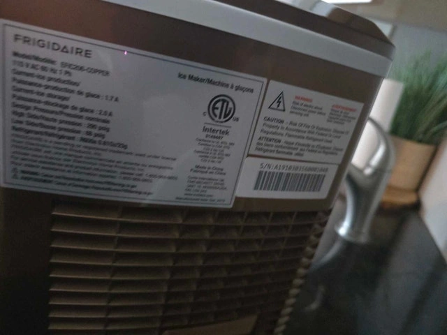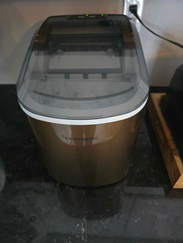 Keep your drinks cool with this Frigidaire ice maker, perfect for home or office use. This used ice maker is in good condition and ready to produce ice quickly and efficiently. It features a compact design that fits easily on countertops, and it makes ice in two different sizes. Brand: Frigidaire Model: EFIC206-COPPER Ice Production: 26 lb/day Water Tank Capacity: 1.7L If the ad is up, it's available!