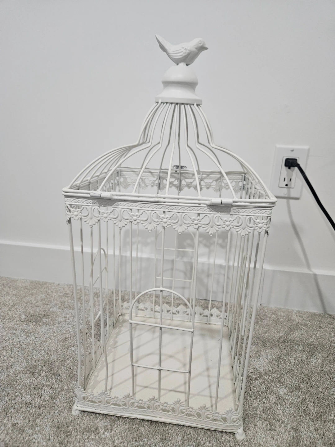Ornate white metal bird cage with decorative detailing. Features a charming bird topper and a latching door. Great for home decor or as a unique display piece.