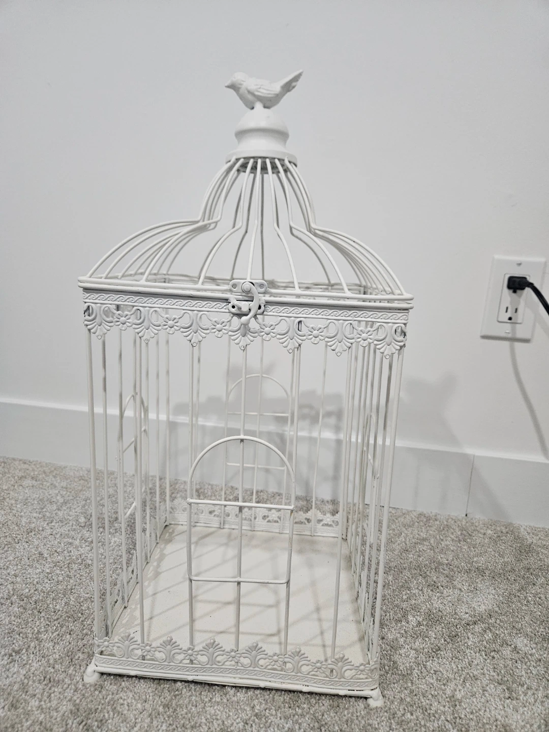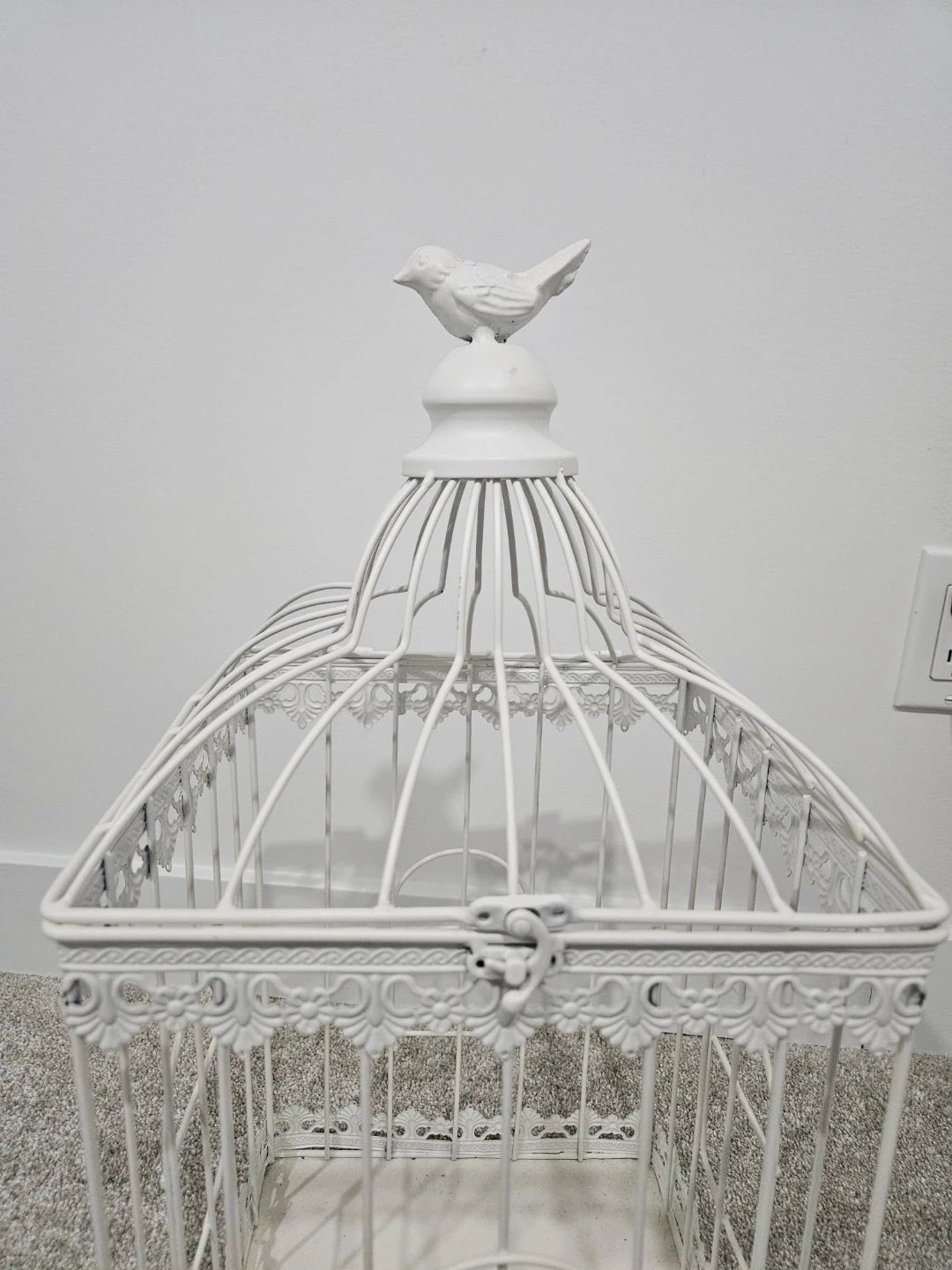 Ornate white metal bird cage with decorative detailing. Features a charming bird topper and a latching door. Great for home decor or as a unique display piece.
