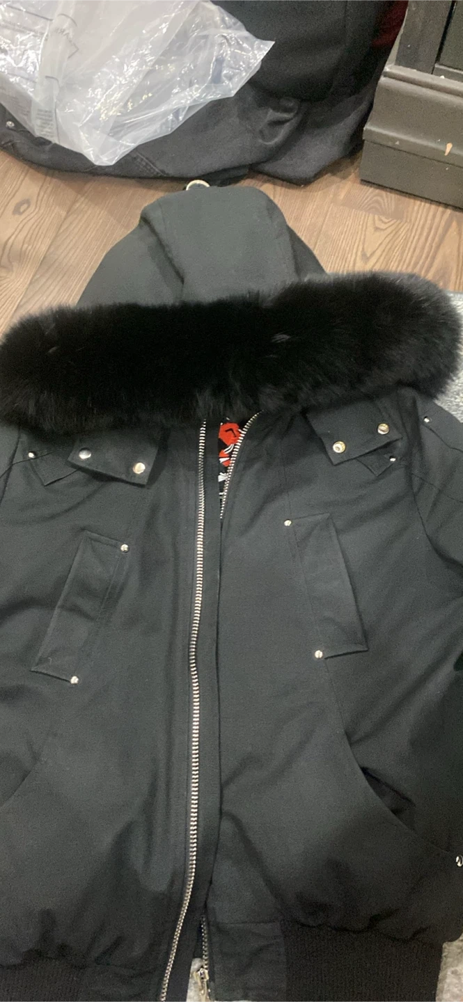Selling a Moose Knuckles bomber jacket in black! It's a stylish and warm jacket, perfect for the Canadian winter. It features the iconic Moose Knuckles logo on the sleeve.