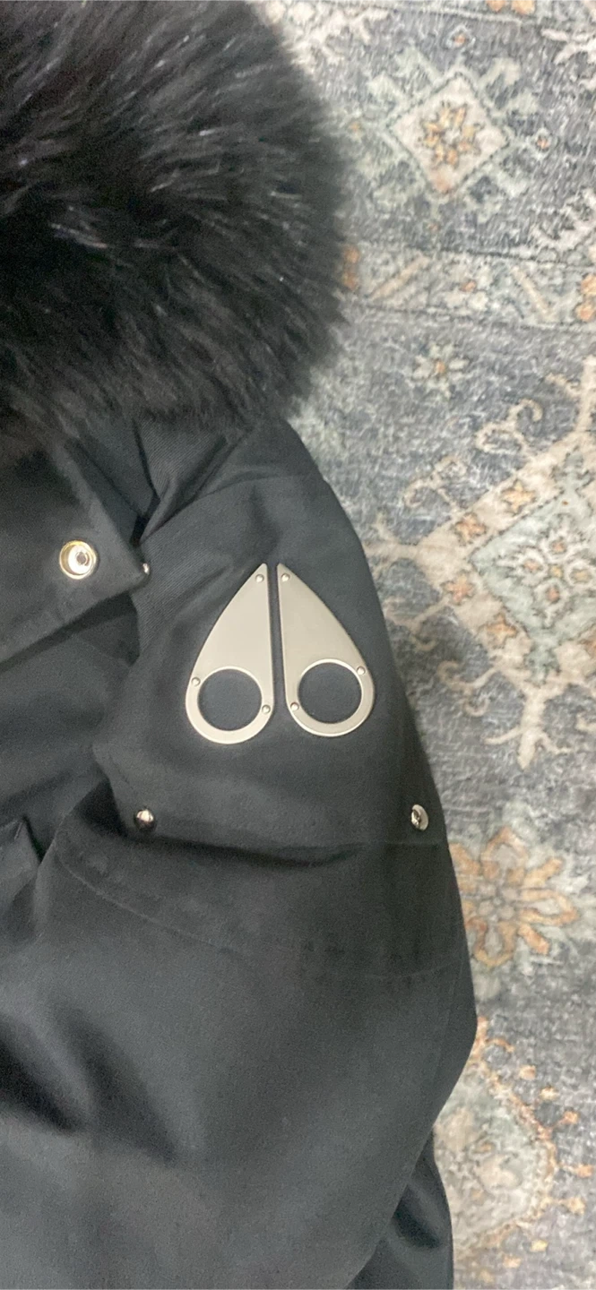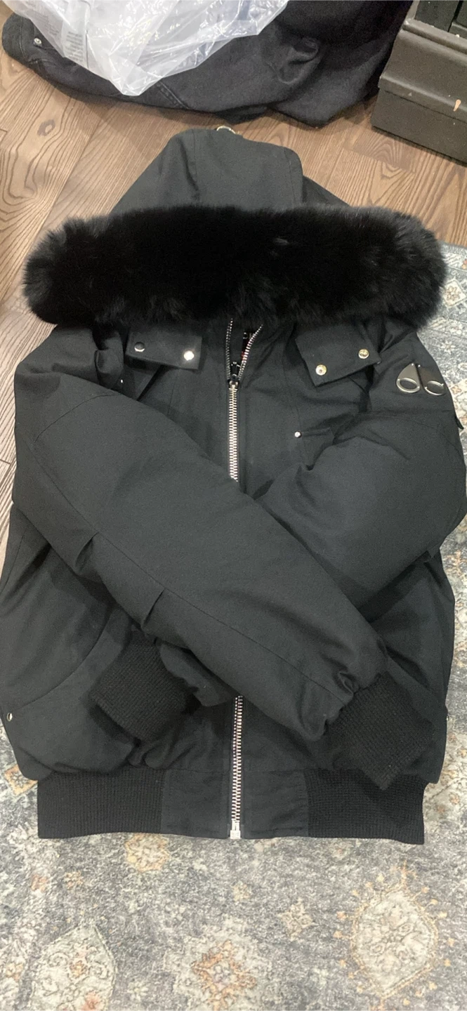 Selling a Moose Knuckles bomber jacket in black! It's a stylish and warm jacket, perfect for the Canadian winter. It features the iconic Moose Knuckles logo on the sleeve.