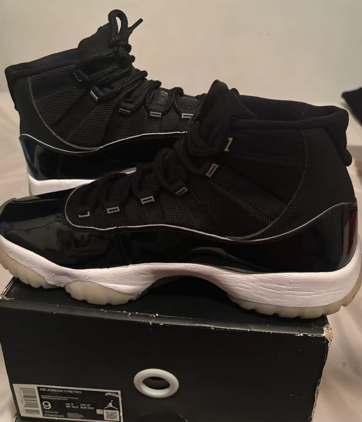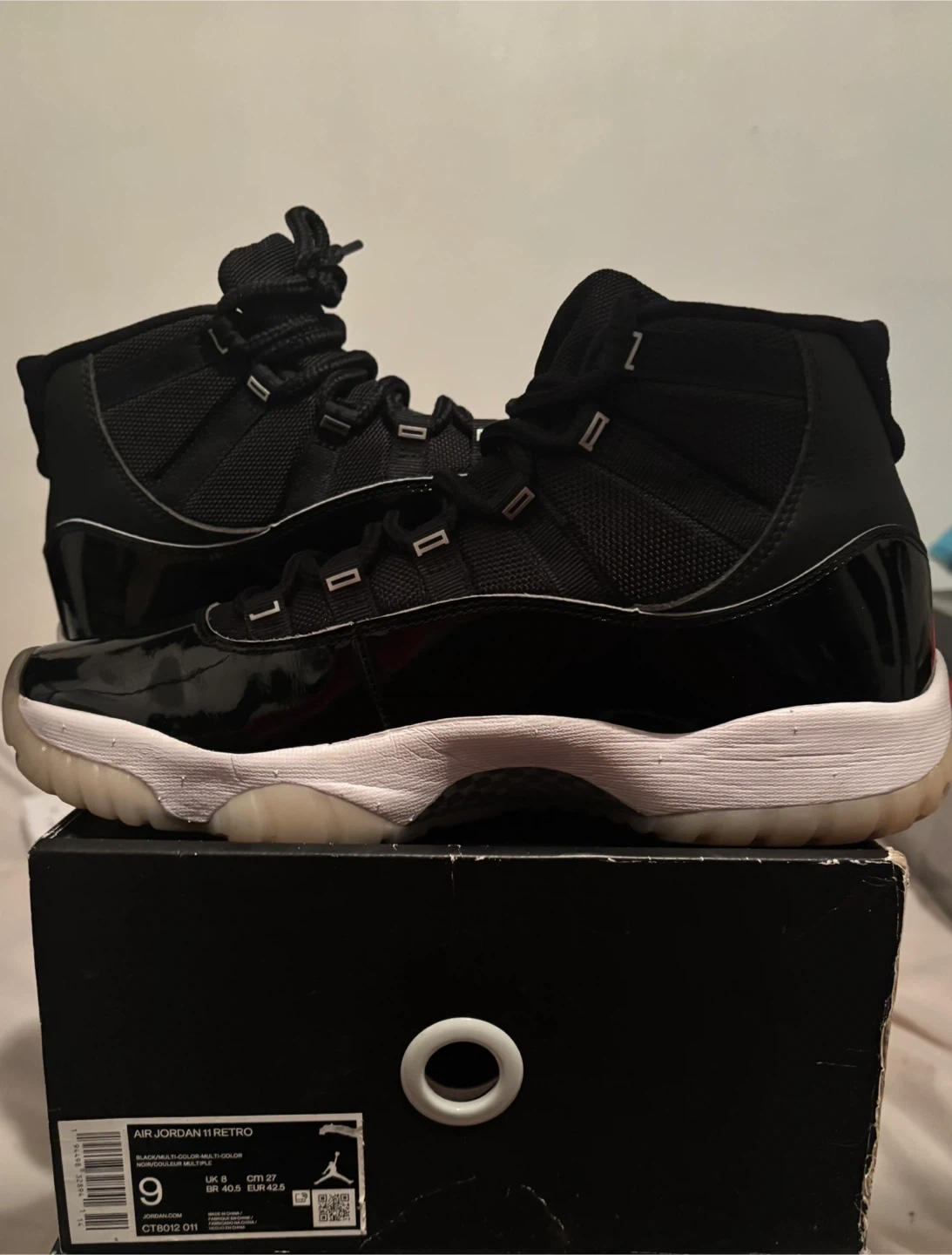 These are Air Jordan 11 Retro sneakers in black. They feature a patent leather toe box and accents, with textile and leather uppers. The size is men's 9.
