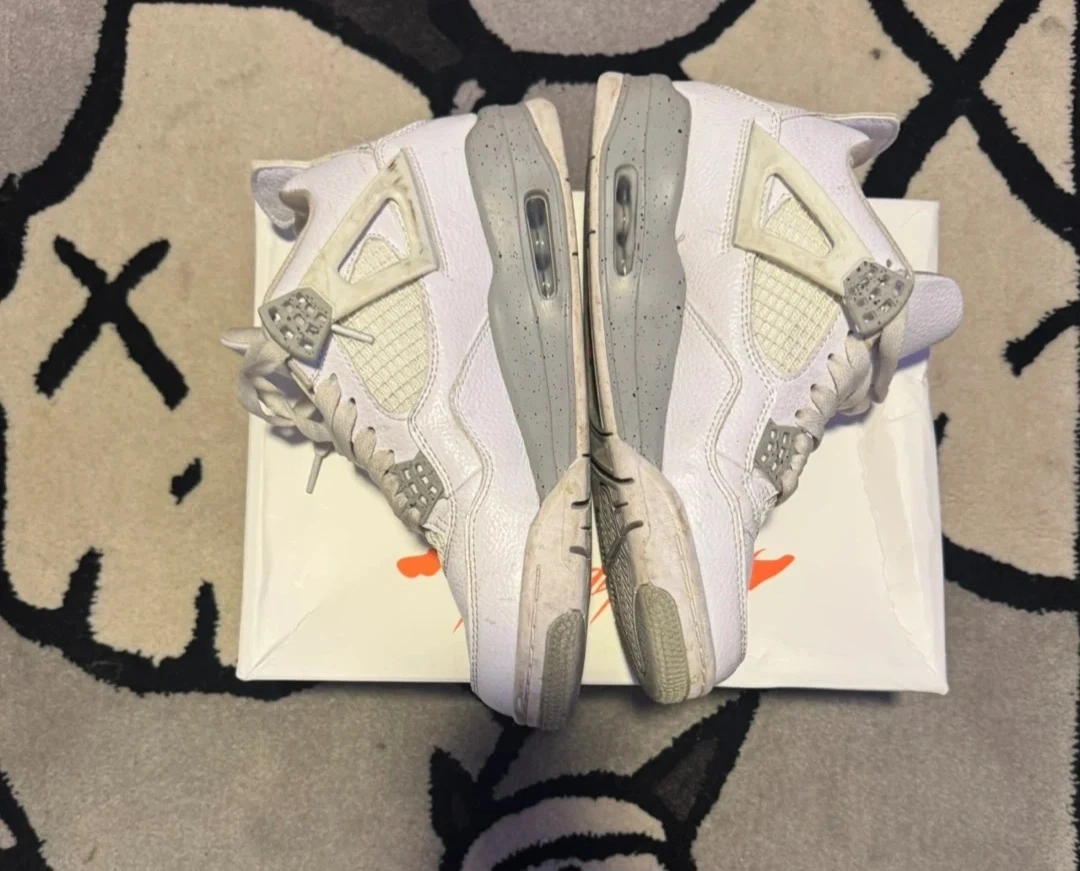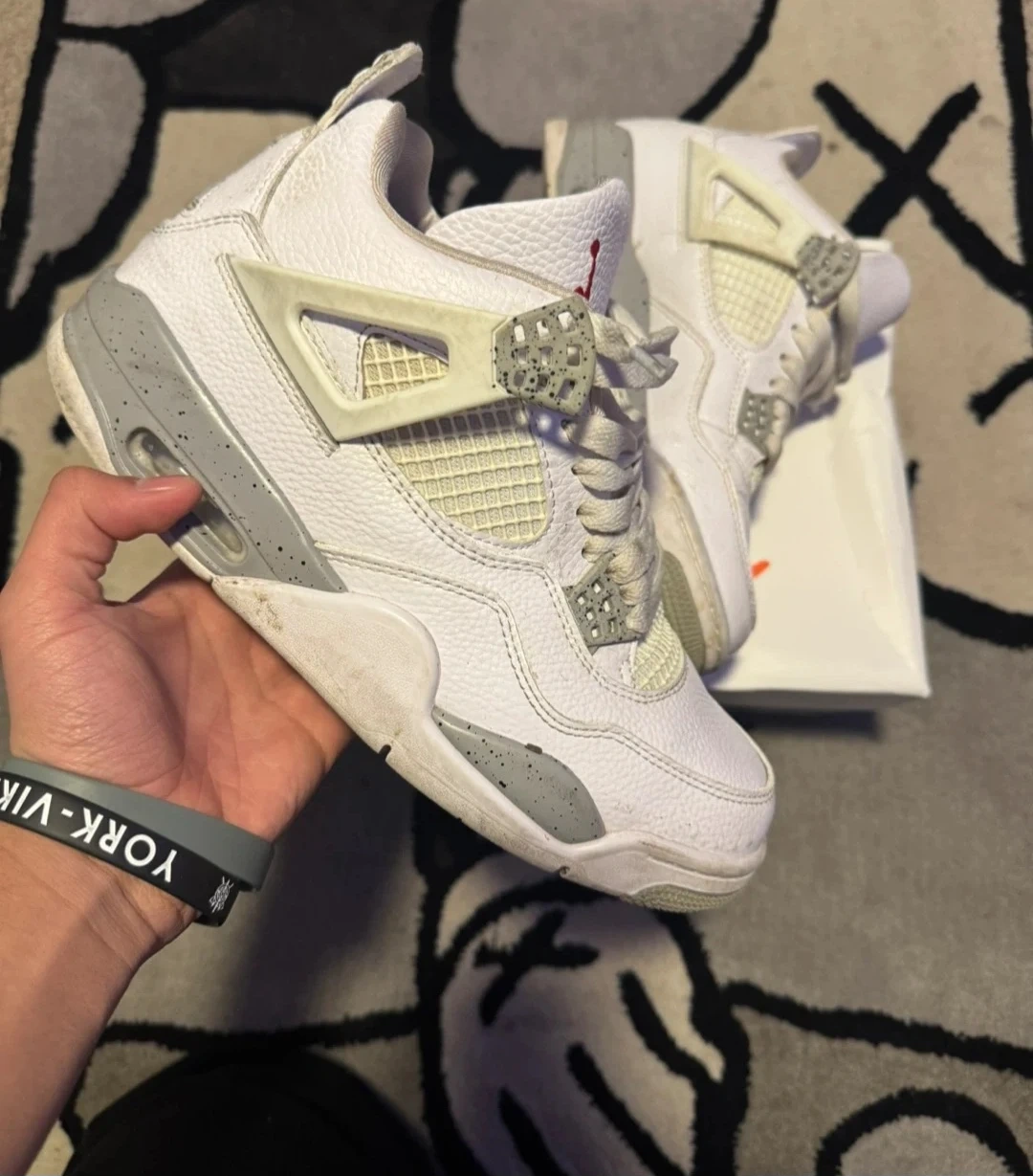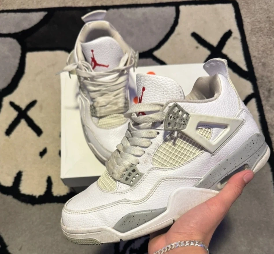 These are the Jordan 4 "White Cement" sneakers. Leather upper with grey speckled accents and the signature Jordan wing overlays. Includes original box.