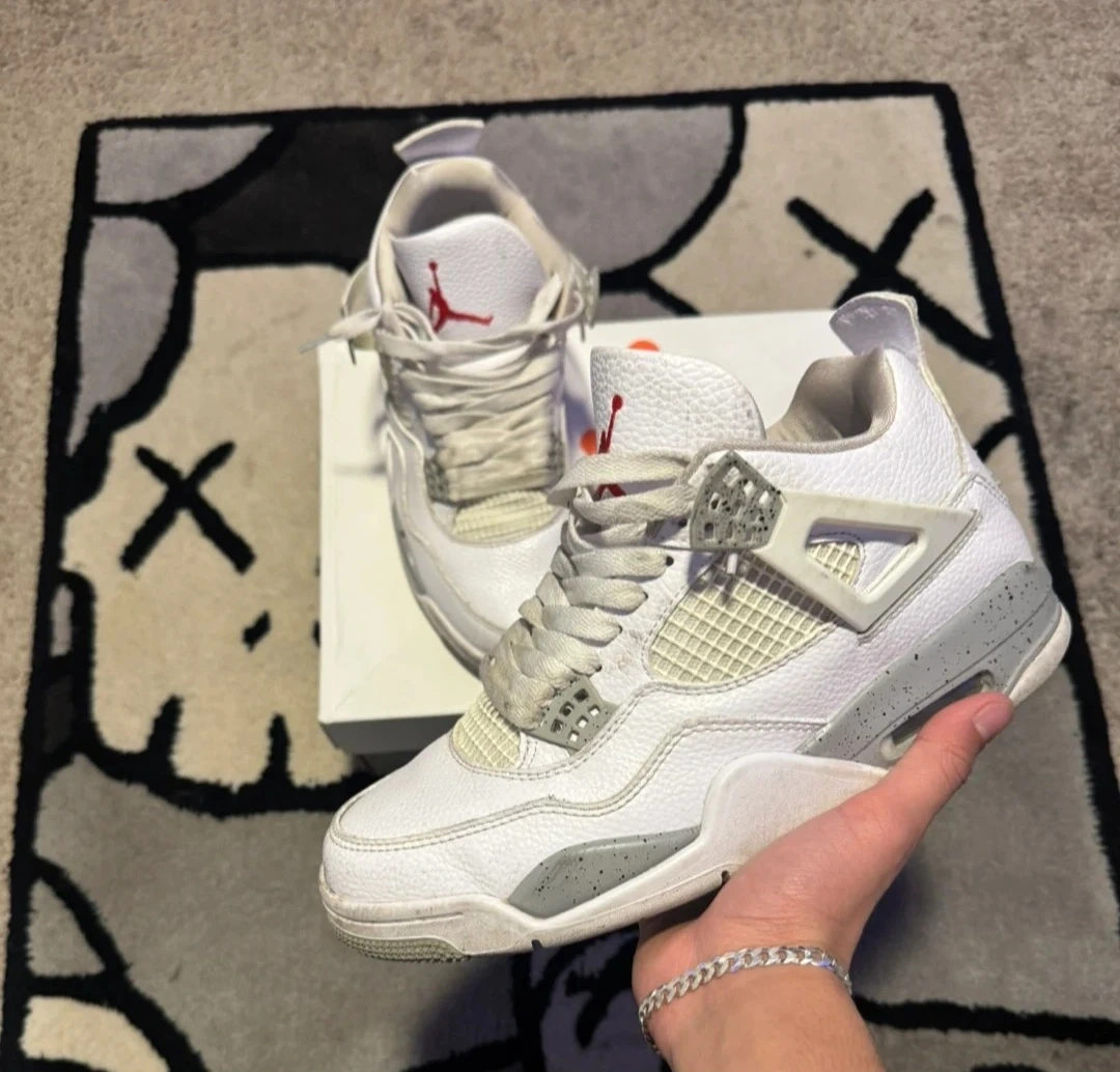 These are the Jordan 4 "White Cement" sneakers. Leather upper with grey speckled accents and the signature Jordan wing overlays. Includes original box.